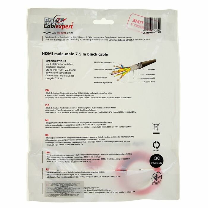 Cablexpert Кабель HDMI 7.5м v2.0 19M/19M черный позол.разъемы экран пакет CC-HDMI4-7.5M