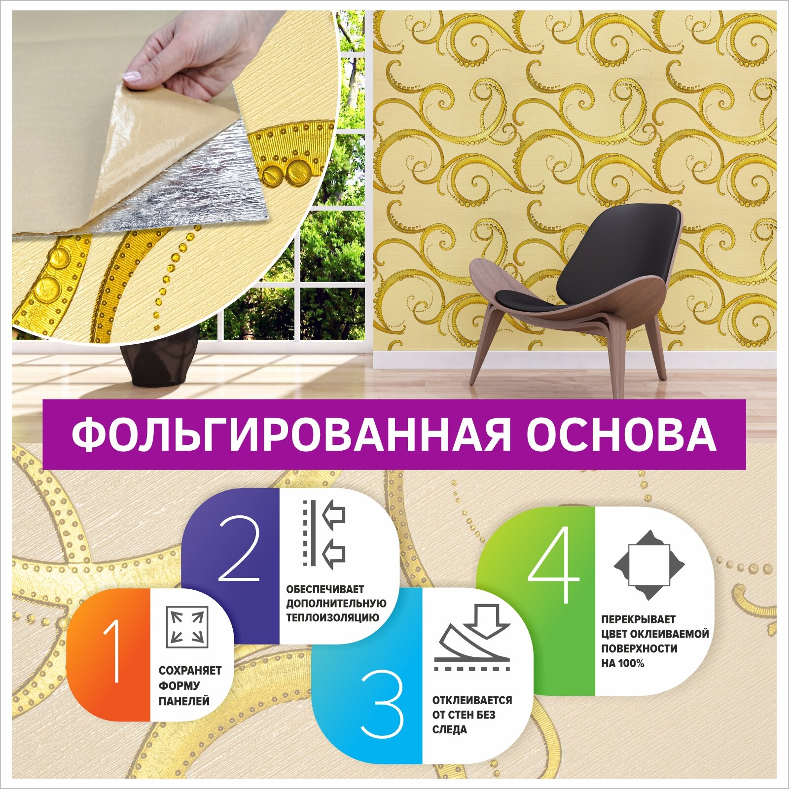 СохранитьСамоклеющаяся панель для стен мягкая с фольгой "Завитки золотистые" 10 шт. 3D 690*690*4 мм 3Д обои для кухни моющиеся фартук на стену интересное: