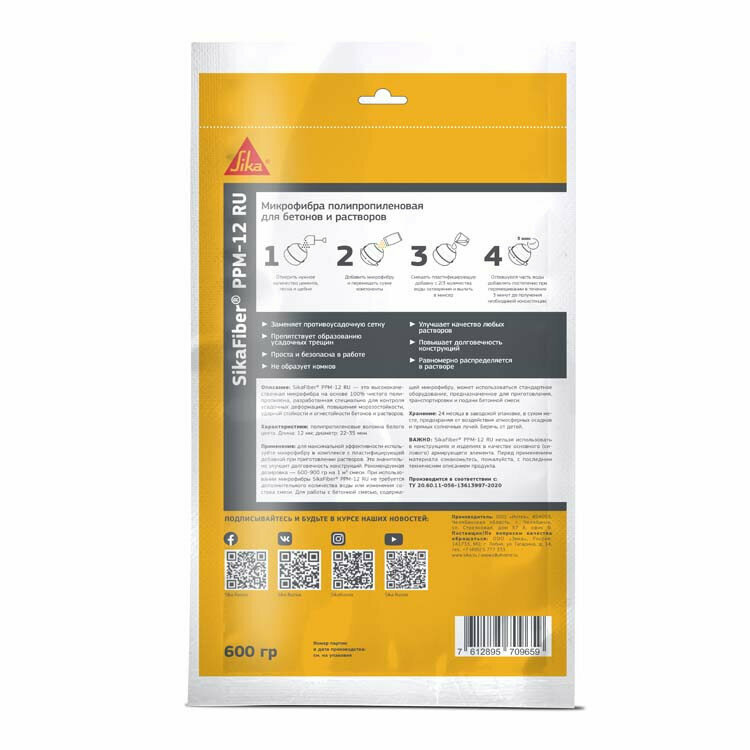 | Дополнительная информация | Армирующая фибра для бетона SikaFiber PPM-12 150 г |
