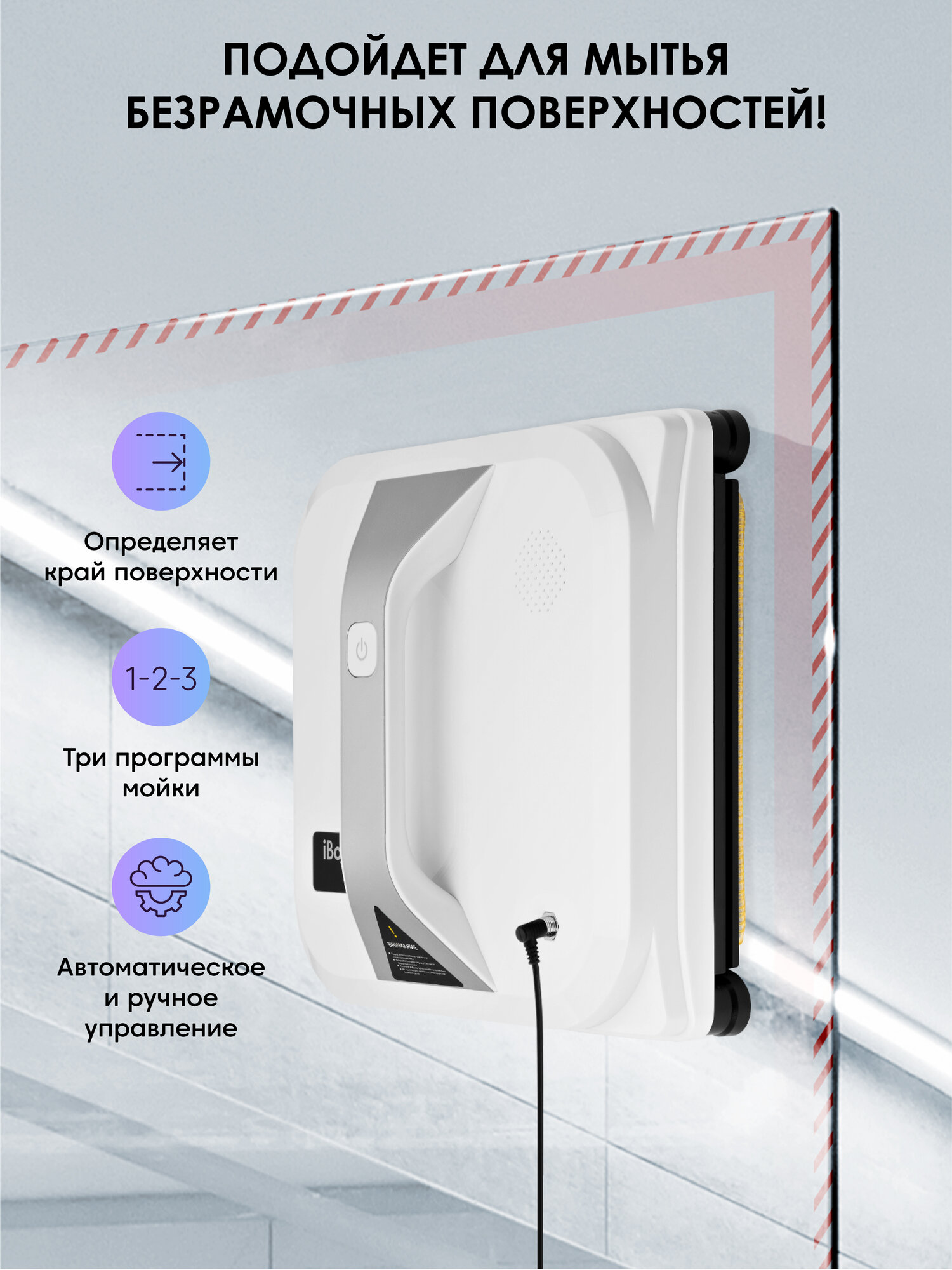 автоматическая остановка / автоматическое определение зоны уборки / звуковая индикация / мойка безрамных поверхностей / обход препятствий / светодиодная индикация