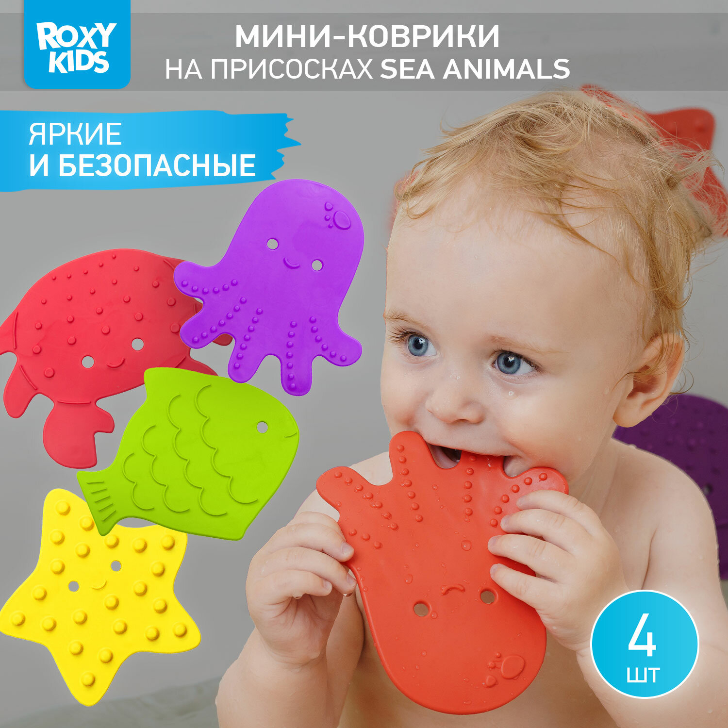 Мини-коврики для ванной детские противоскользящие на присосках набор SEA ANIMALS, 4шт. интересное:
