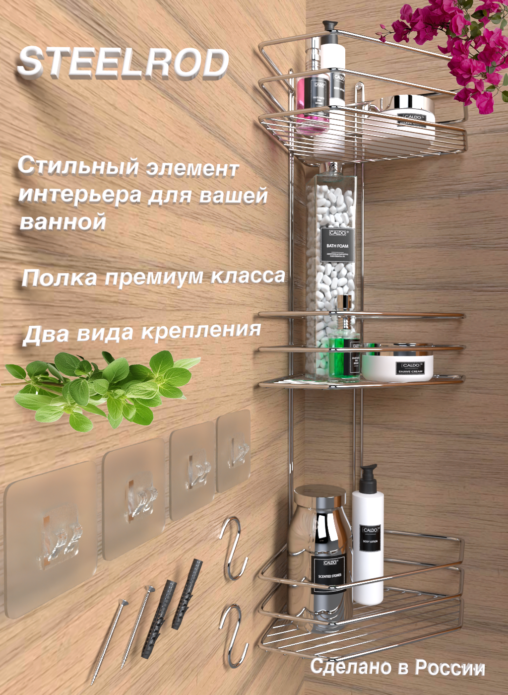 | Комплектация | полка для ванной - 1 шт; крепеж (саморез и дюбель) - 2 шт; крепеж (силиконовые крючки) - 2 шт; картонная коробка - 1 шт |