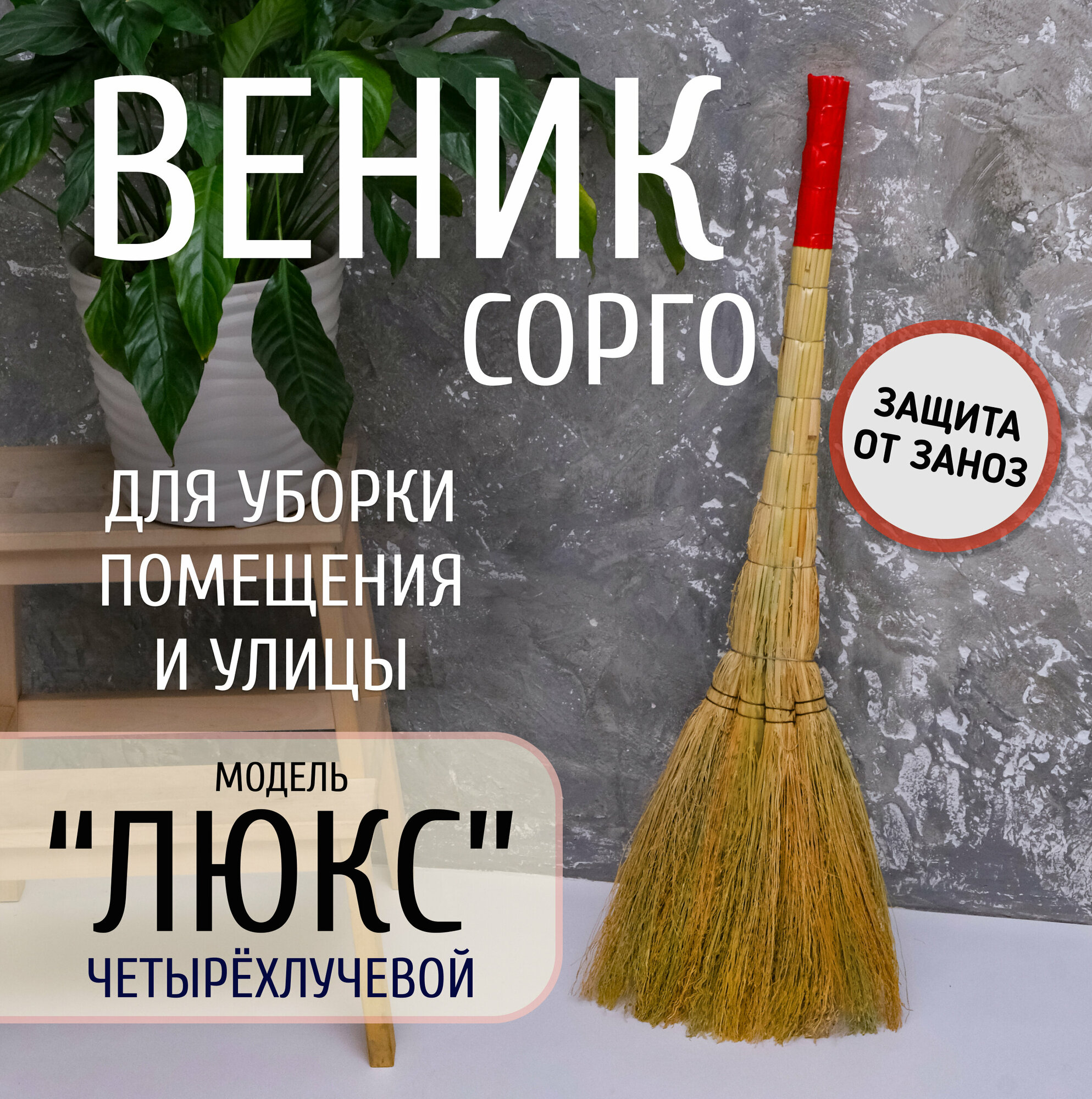 Купить Веник для уборки сорго люкс 4-лучевой, 90-100 см, 400-450 гр Ручка в пленке.
