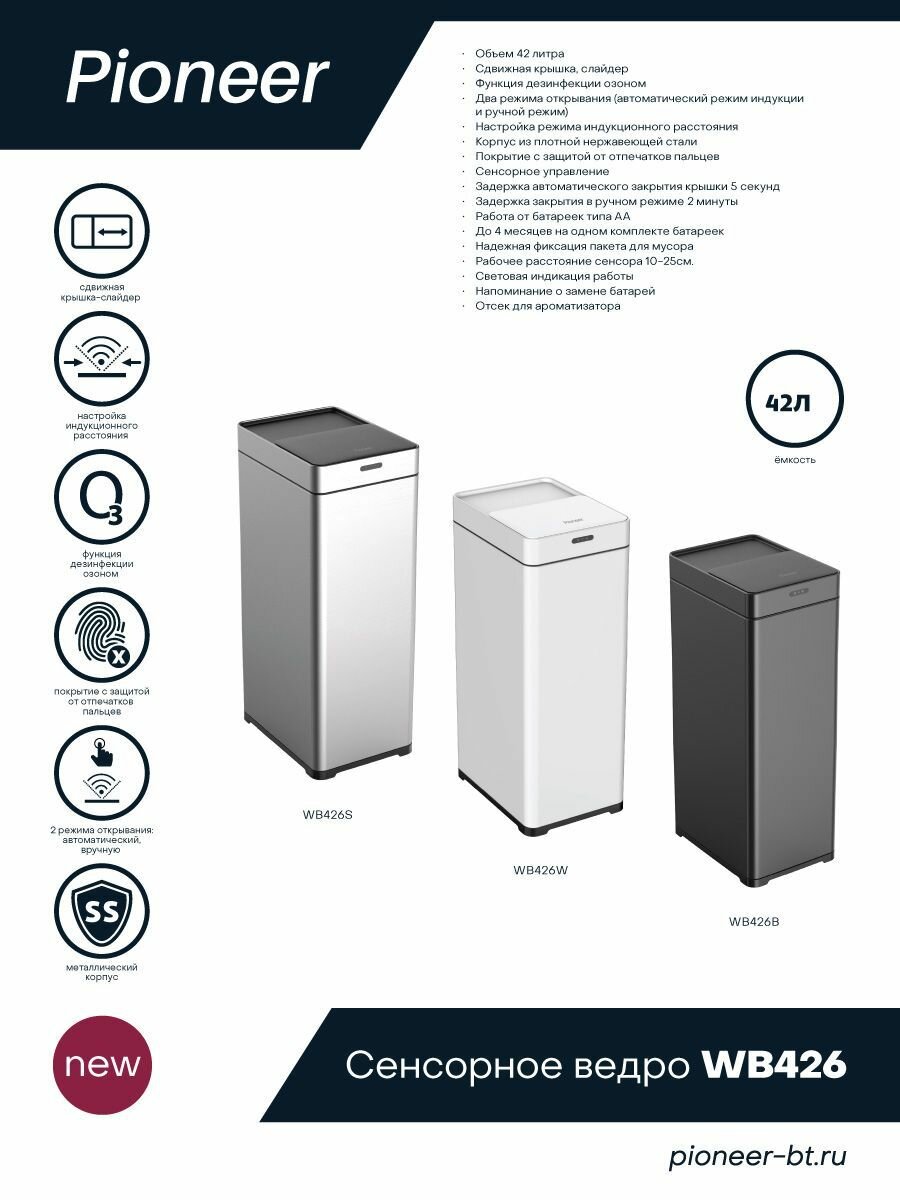 Ниже Вы можете прочитать отзывы на Мусорное ведро сенсорное металлическое с сдвижной крышкой Pioneer WB426W42 литра / дезинфекция озоном / Умное ведро / 2 режима открывания, ознакомится с подробными характеристиками, посмотреть интересные обзоры и фотографии на Мусорное ведро сенсорное металлическое с сдвижной крышкой Pioneer WB426W42 литра / дезинфекция озоном / Умное ведро / 2 режима открывания.