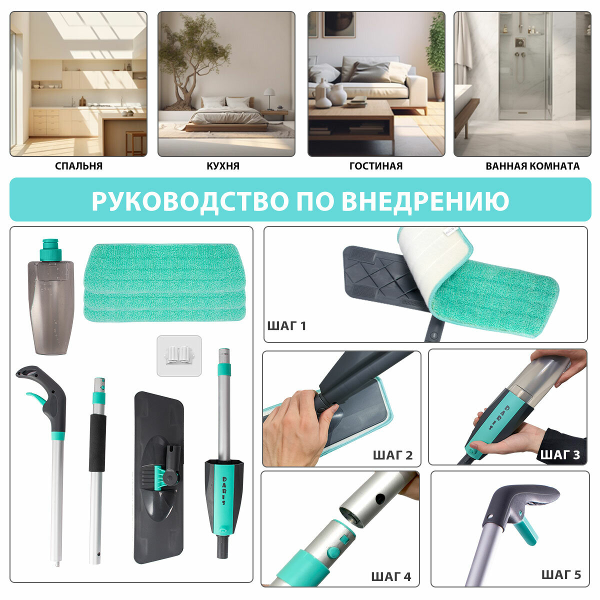 Швабра DARIS с распылителем и 3 насадки, серо-голубая интересное: