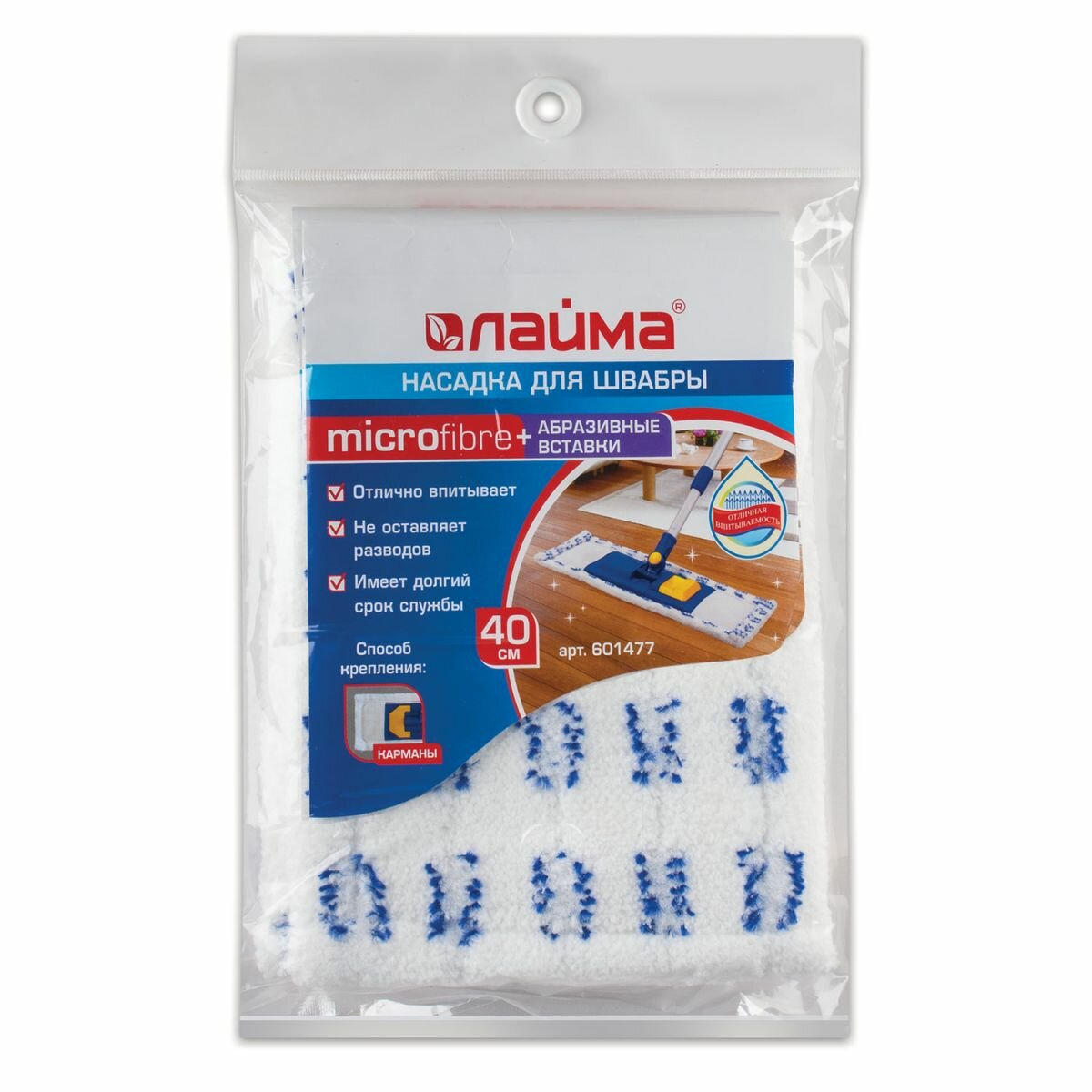 Насадка МОП плоская для швабры/держателя 40 см, карманы (ТИП К), микрофибра/абразив, упаковка, LAIMA, 601477