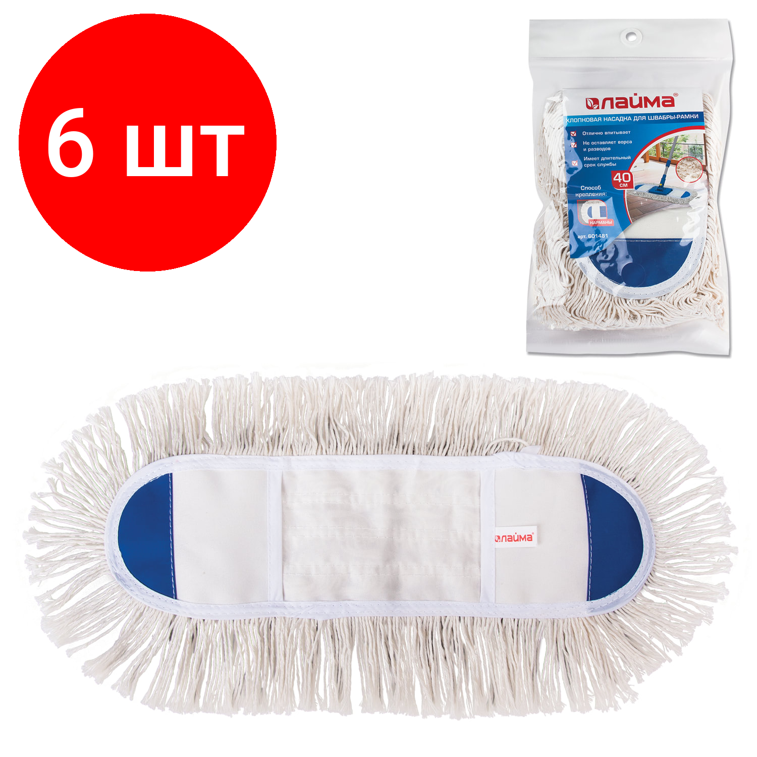 Купить Комплект 6 шт, Насадка МОП плоская 40 см для швабры-рамки, карманы, хлопок, LAIMA, 601481