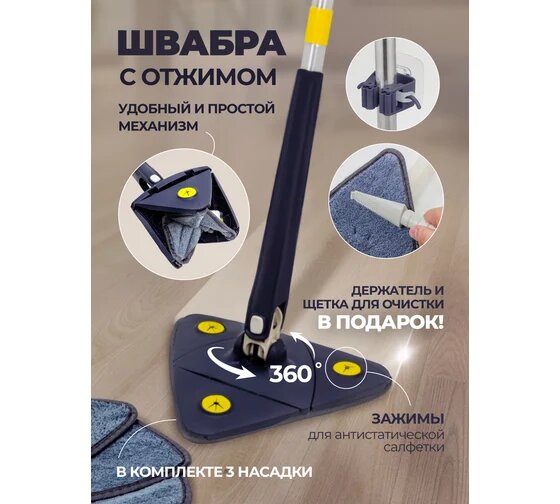 Швабра для влажной и сухой уборки с отжимом, 3 насадки (микрофибра), настенный держатель, щетка для чистки мопа