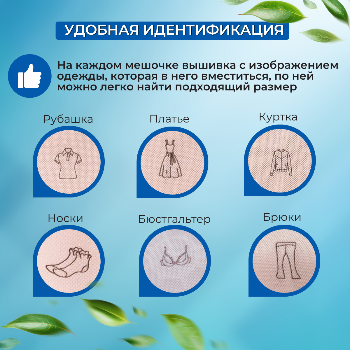 | Подробная комплектация | В набор входит: Сумка для куртки: 60 x 50 см Сумка для платьев: 50 x 40 см Сумка для рубашек: 40 x 30 см Сумка для брюк 20х30 см Сумка для носков 22х18 см Сумка для бюстгальтера: 17 x 17 см |