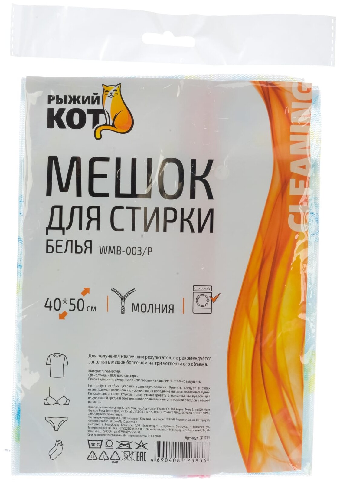 | Подробная комплектация | Мешок для стирки белья РЫЖИЙ КОТ, 40х50 см, цветная печать |
