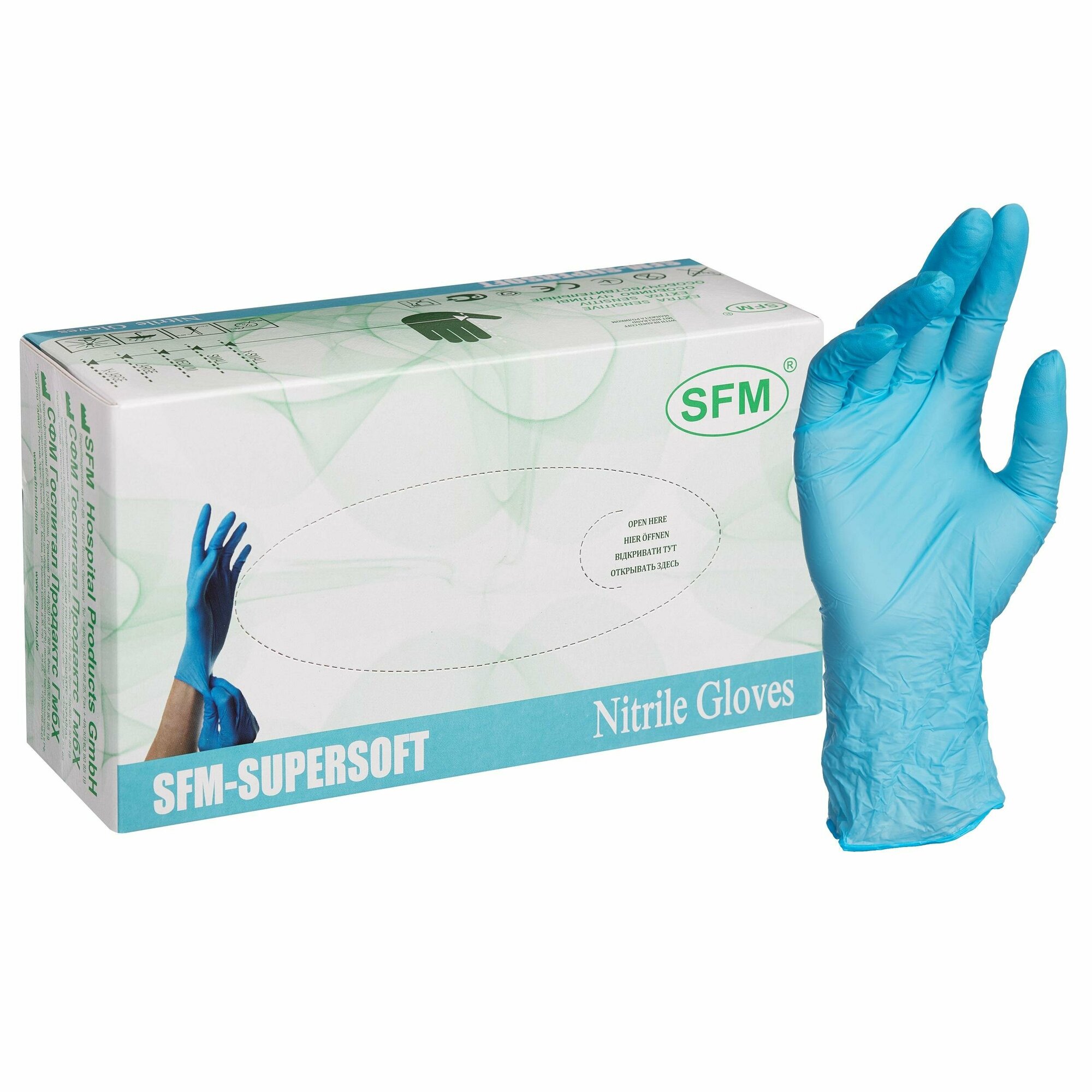 Перчатки нитриловые 24 см SFM-Supersoft Nitrile, цвет: голубой, размер M, 200 шт. (100 пар), неопудренные, текстурированные