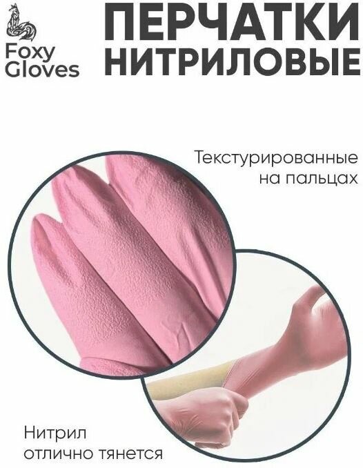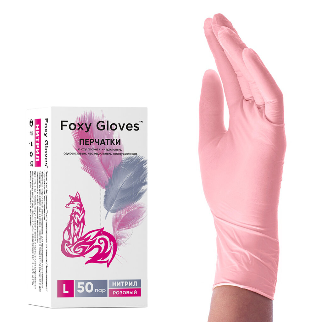 Перчатки маникюрные FOXY-GLOVES нитриловые, одноразовые, смотровые, неопудренные, р-р L, розовый, 50 пар.