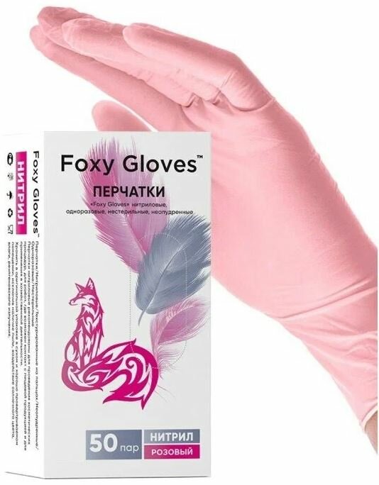 Перчатки "Foxy Gloves" нитриловые, одноразовые, нестерильные, неопудренные, 100 штук, 50 пар, размер M, розовые