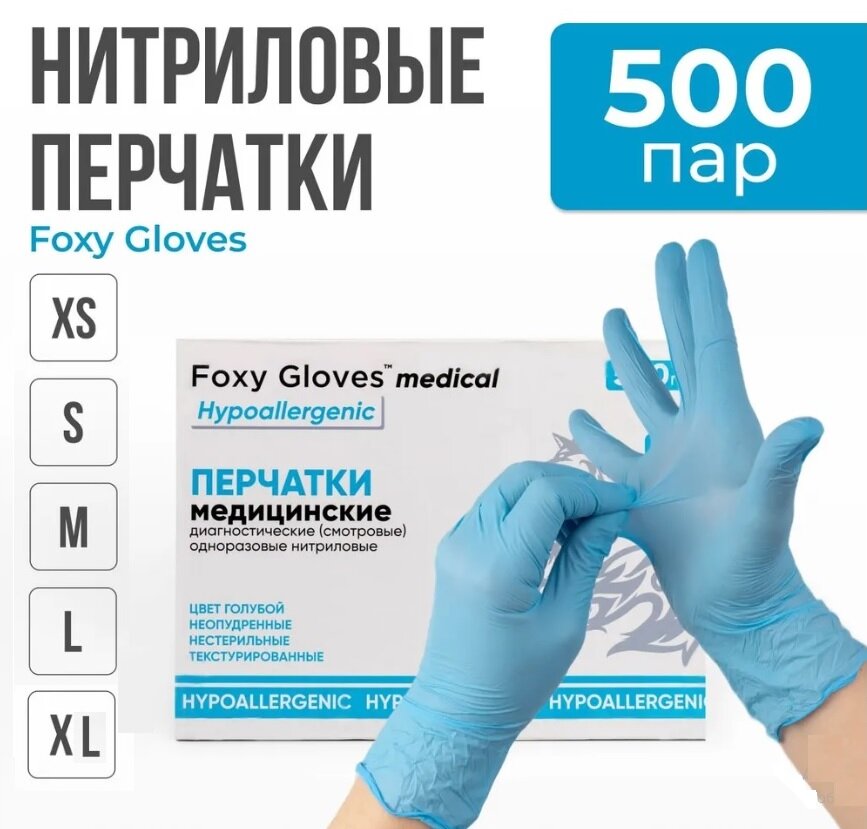 Перчатки маникюрные FOXY-GLOVES нитриловые, одноразовые, смотровые, неопудренные, р-р M, голубой, 500 пар.