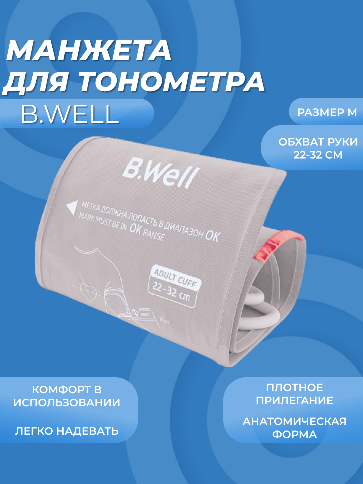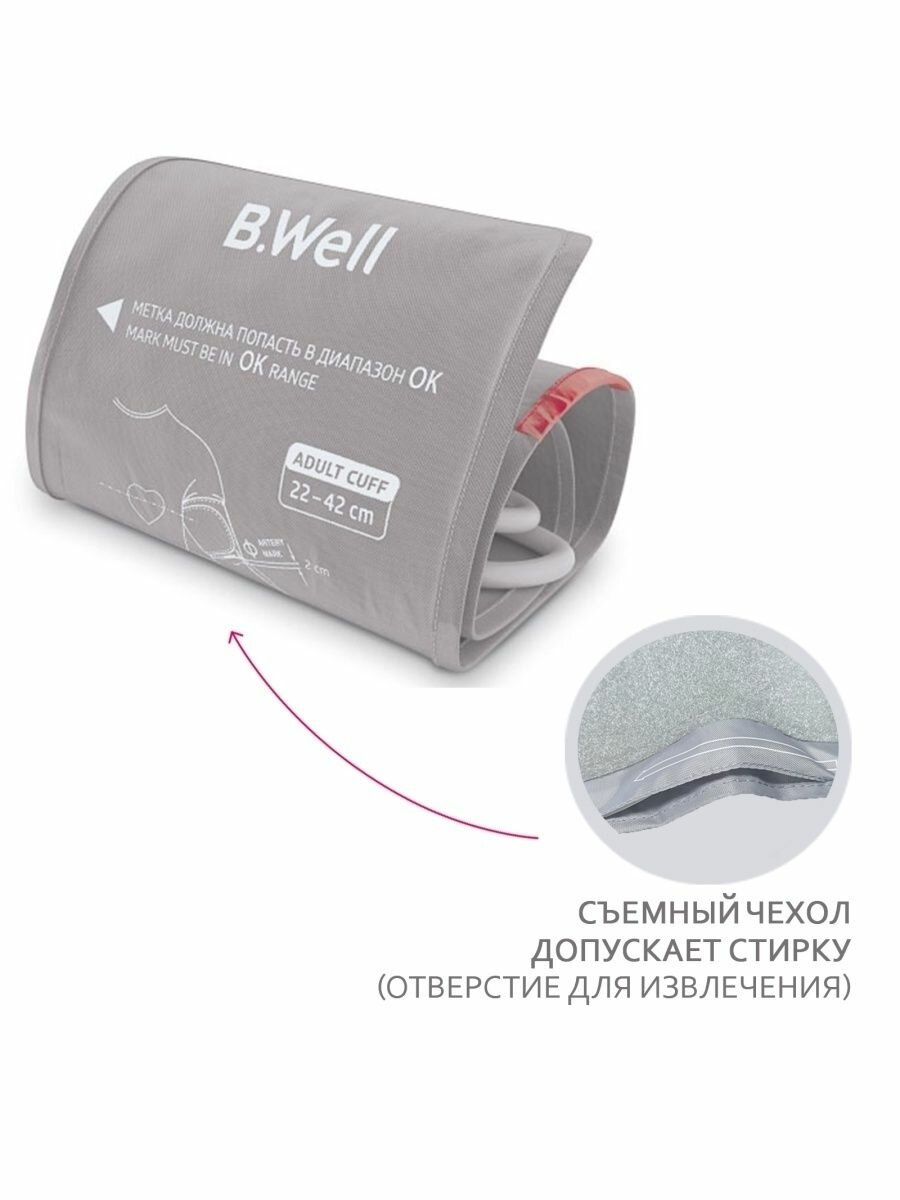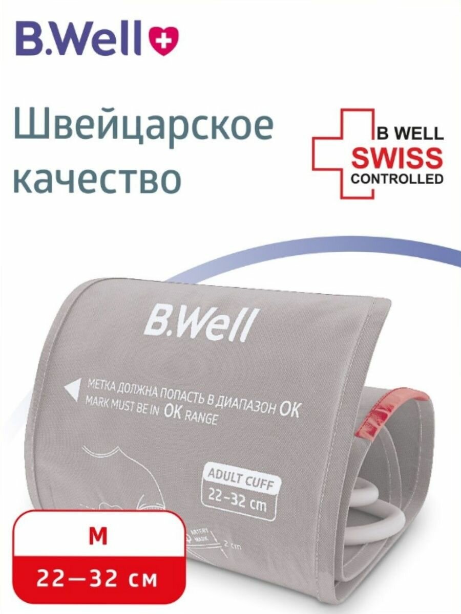 | Совместимость | манжета подходит для всех электронных тонометров B.Well, измеряющих давление на плече: тонометров линии PRO, линии MED, а также тонометров серии WA и А-23 |