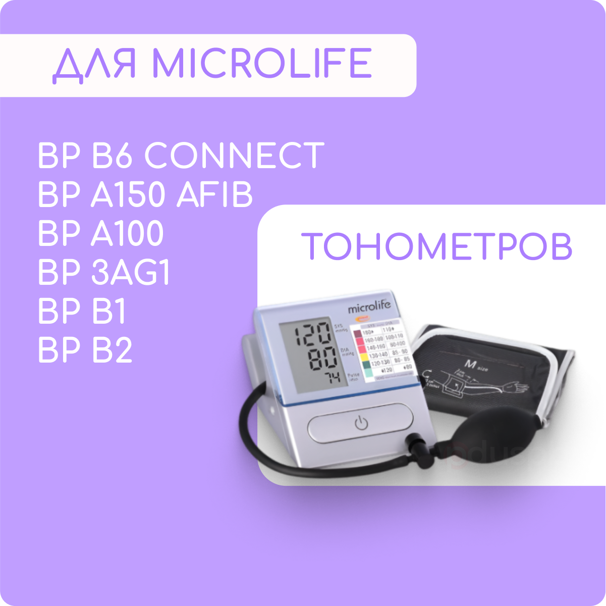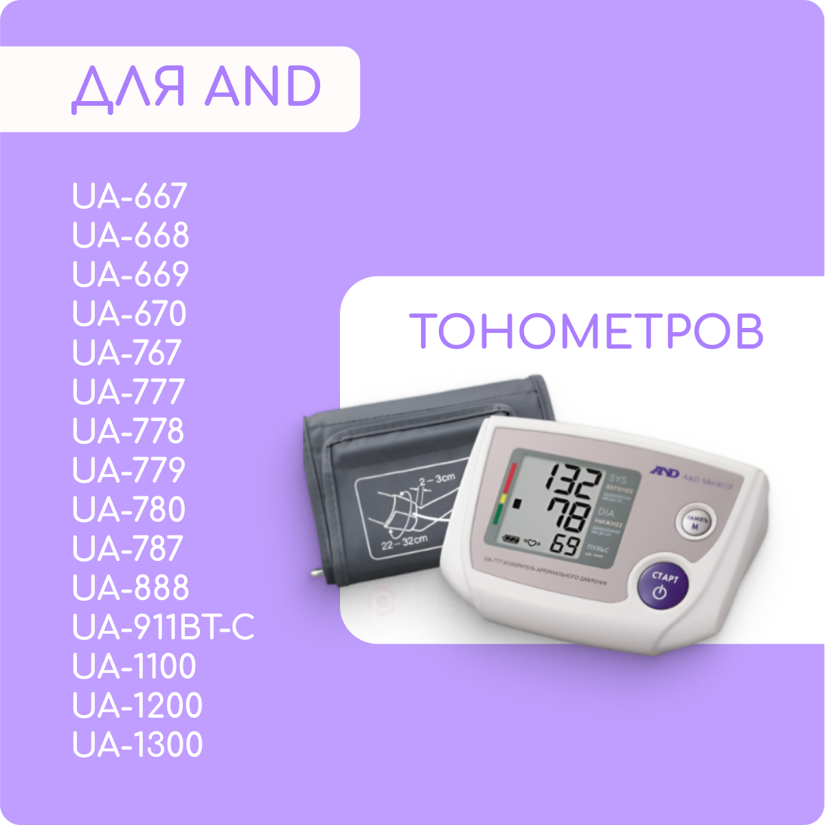 | Совместимость | Тонометр, небулайзер, ингалятор Omron 717 B.Well AD 156, AD 155, PRO-33, PRO-34, PRO-35, PRO-36 AND / A&D модели: UA-667, UA-668, UA-669, UA-670, UA-767, UA-777, UA-778, UA-779, UA-780, UA-787, UA-888, UA-911BT-C, UA-1100, UA-1200, UA-1300, TB-182С Little Doctor модели: LD3, LD5, LD23, LD51, LD6 Nissei модели: DS-10a, DS-12A, DS-1011, DS-1031, DS-500, DS-700,DS-1902 Microlife AD-1024C , BP A100, BP 3AG1, BP B1, BP B2, AD-1024, BP B6 Connect, BP A150 AFIB MediTech для автоматических тонометров МТ-30, МТ-40, МТ-50 Armed MediTech Tensoval Medisana Citizen Samsung Gamma Dr. Frei Vega Norditalia Paramed Longevita |