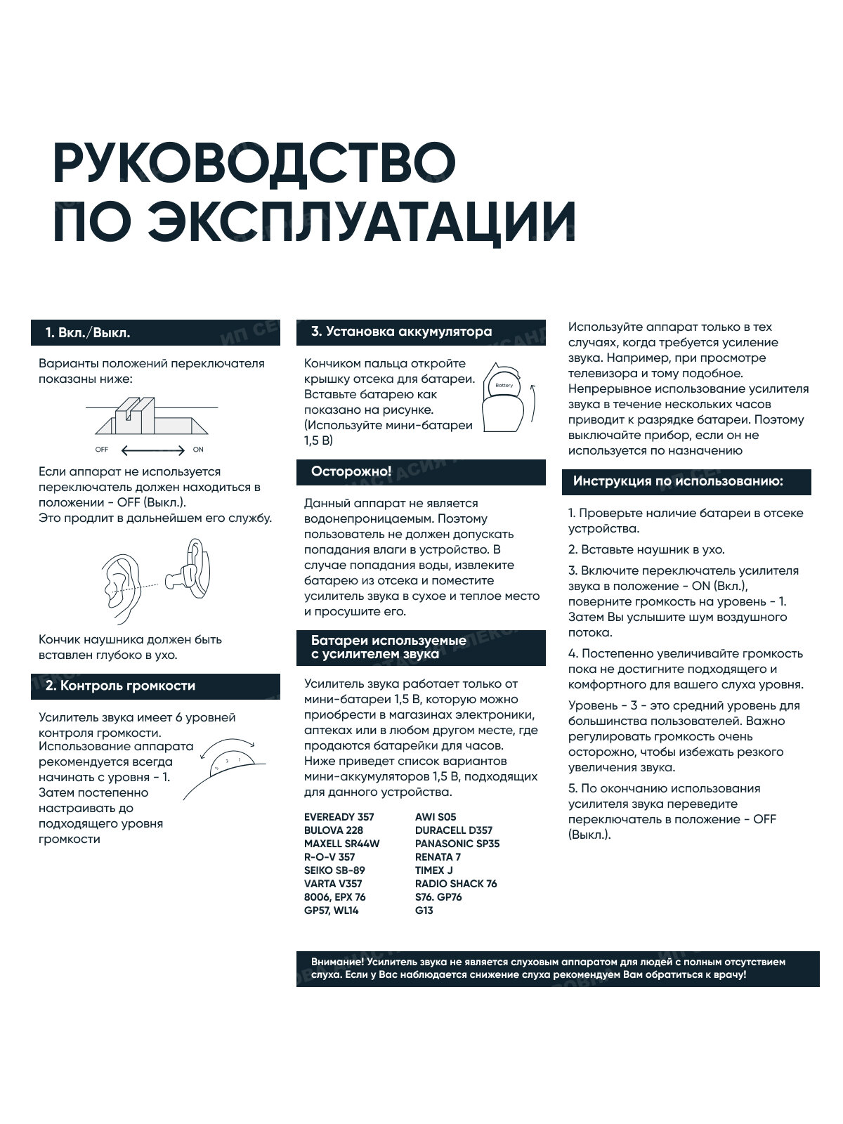 | Подробная комплектация | прибор-усилитель звука, батарейки – 2 шт., силиконовые вкладыши – 3 шт. разного размера, контейнер для хранения, руководство по эксплуатации на русском языке |