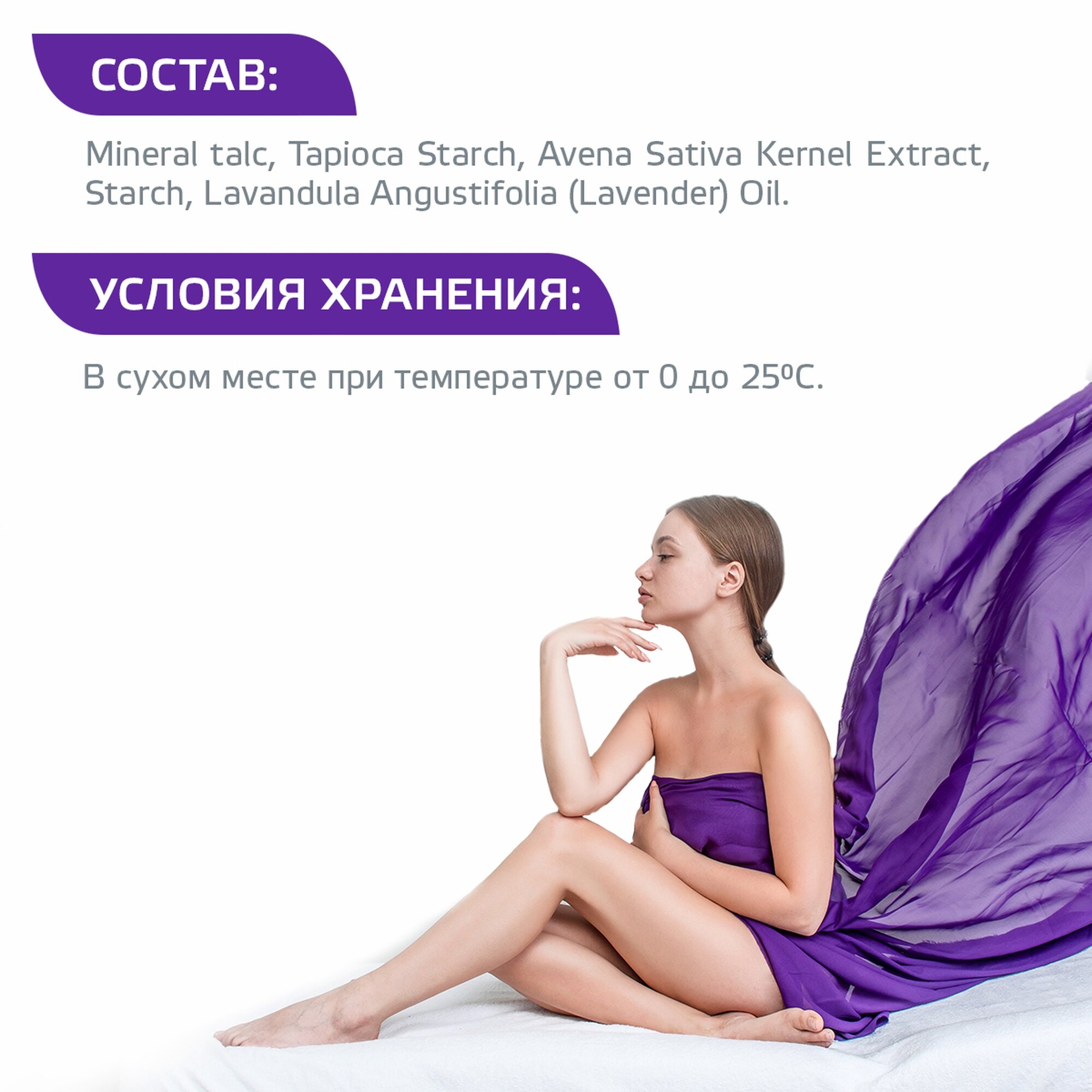 | Состав | mineral talc, tapioca starch, avena sativa kernel extract, starch, lavandula angustifolia (lavender) oil |