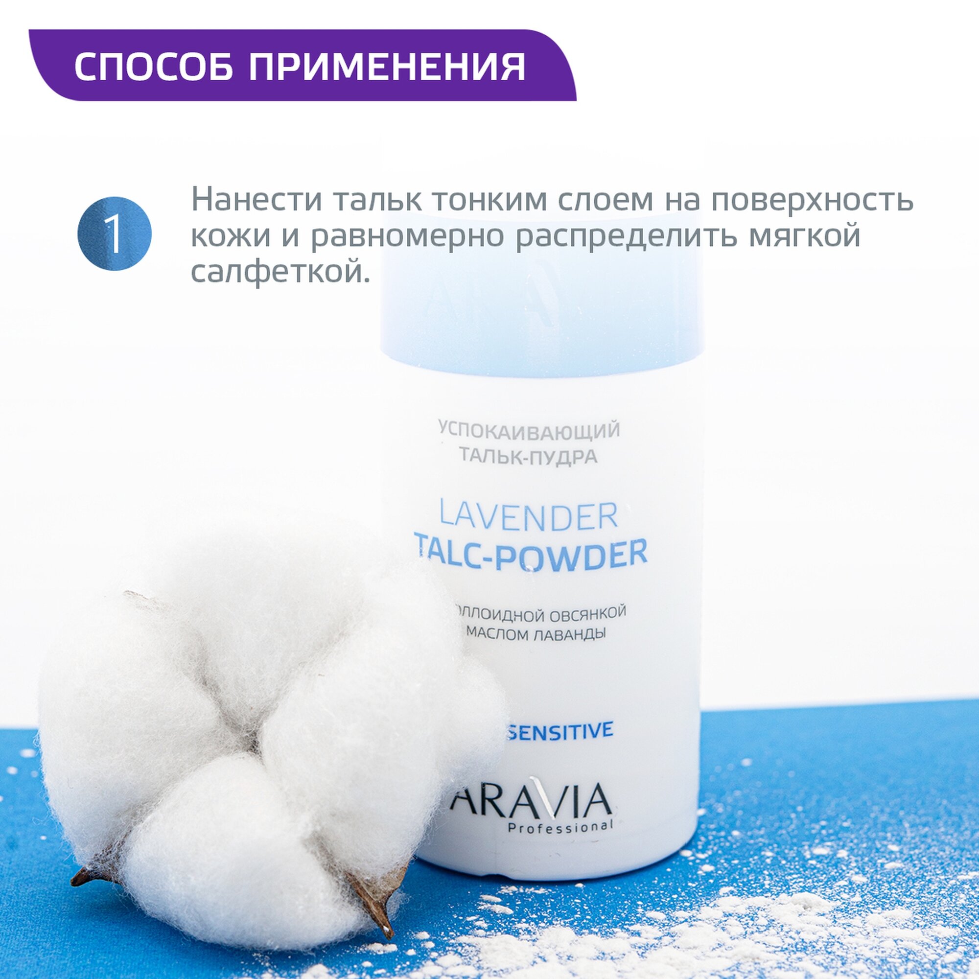 | Способ применения | Нанести тальк тонким слоем на поверхность кожи и равномерно распределить мягкой салфеткой |