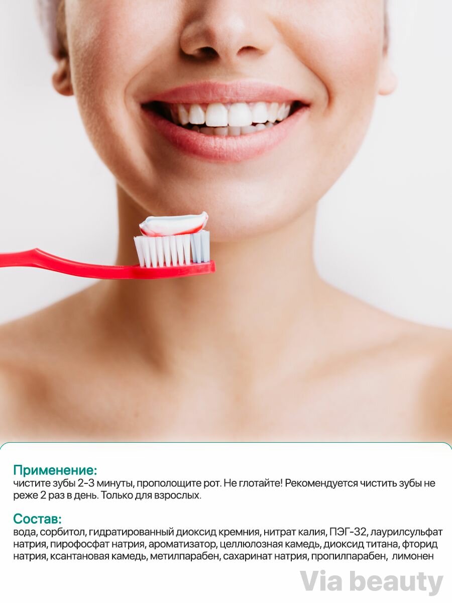 | Состав | вода, сорбитол, гидратированный диоксид кремния, нитрат калия, ПЭГ-32, лаурилсульфат натрия, пирофосфат натрия, ароматизатор, целлюлозная камедь, диоксид титана, фторид натрия, ксантановая камедь, метилпарабен, сахаринат натрия, пропилпарабен, лимонен |