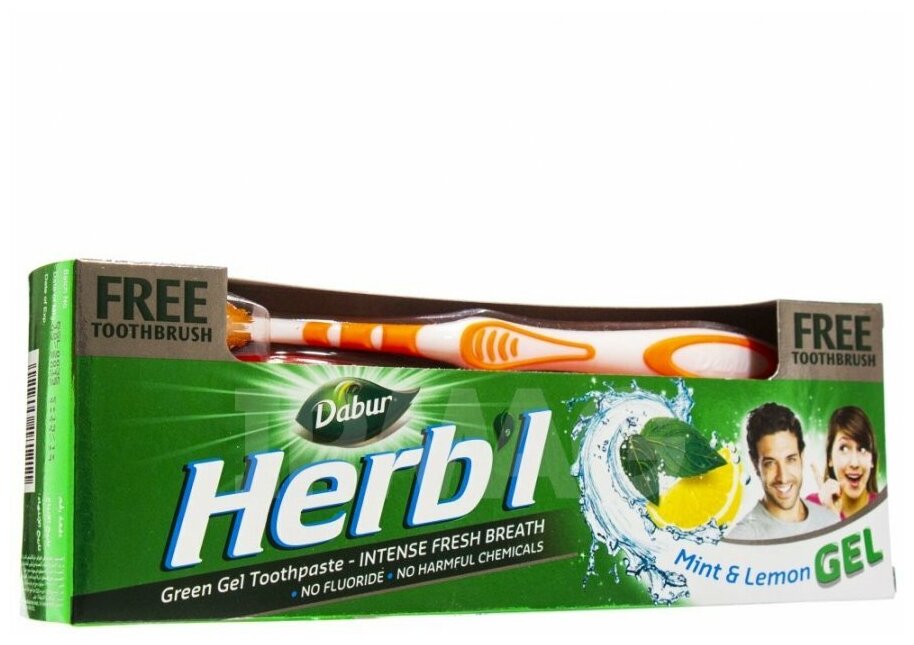 Купить Набор Dabur Herb'l гель зубной освежающий с мятой и лимоном, 150 г + зубная щётка