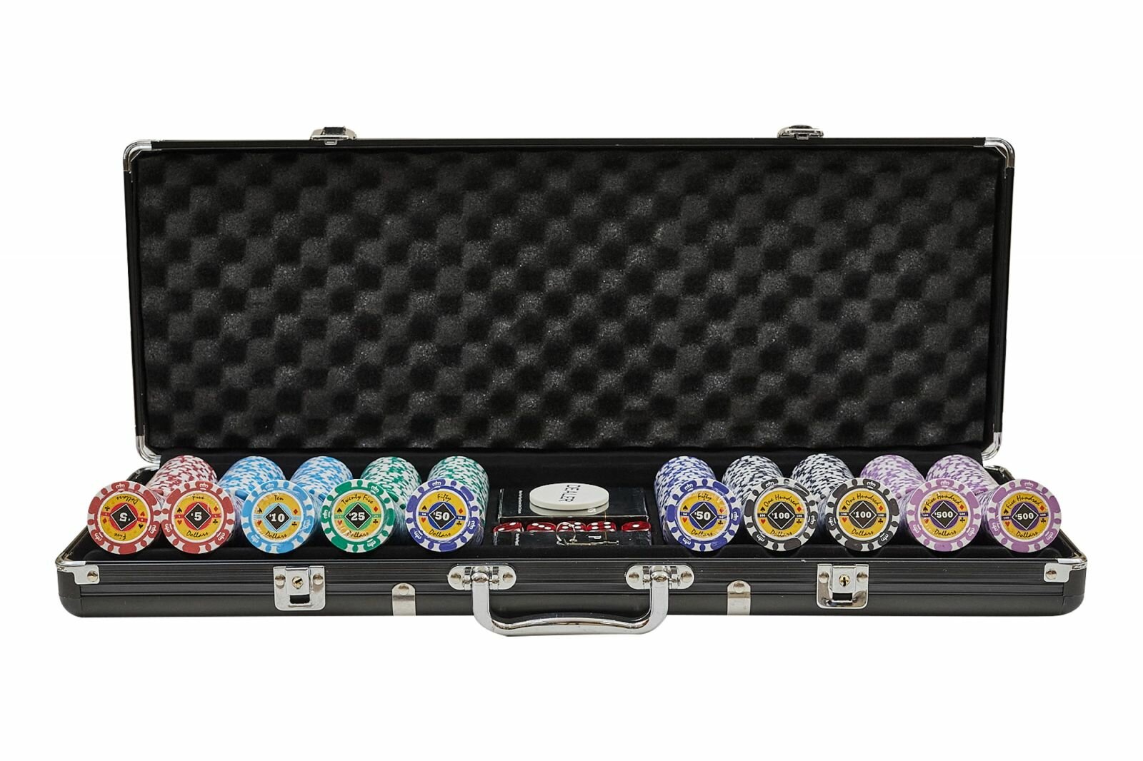 | В наборе | - 500 фишек (номиналы фишек: 5 - 75 шт., 10 - 75 шт., 25 - 75 шт., 50 - 75 шт., 100 - 100 шт., 500 - 100 шт.); - 5 костей; - 2 колоды карт; - фишка дилера; - кейс; - ключи от кейса. |