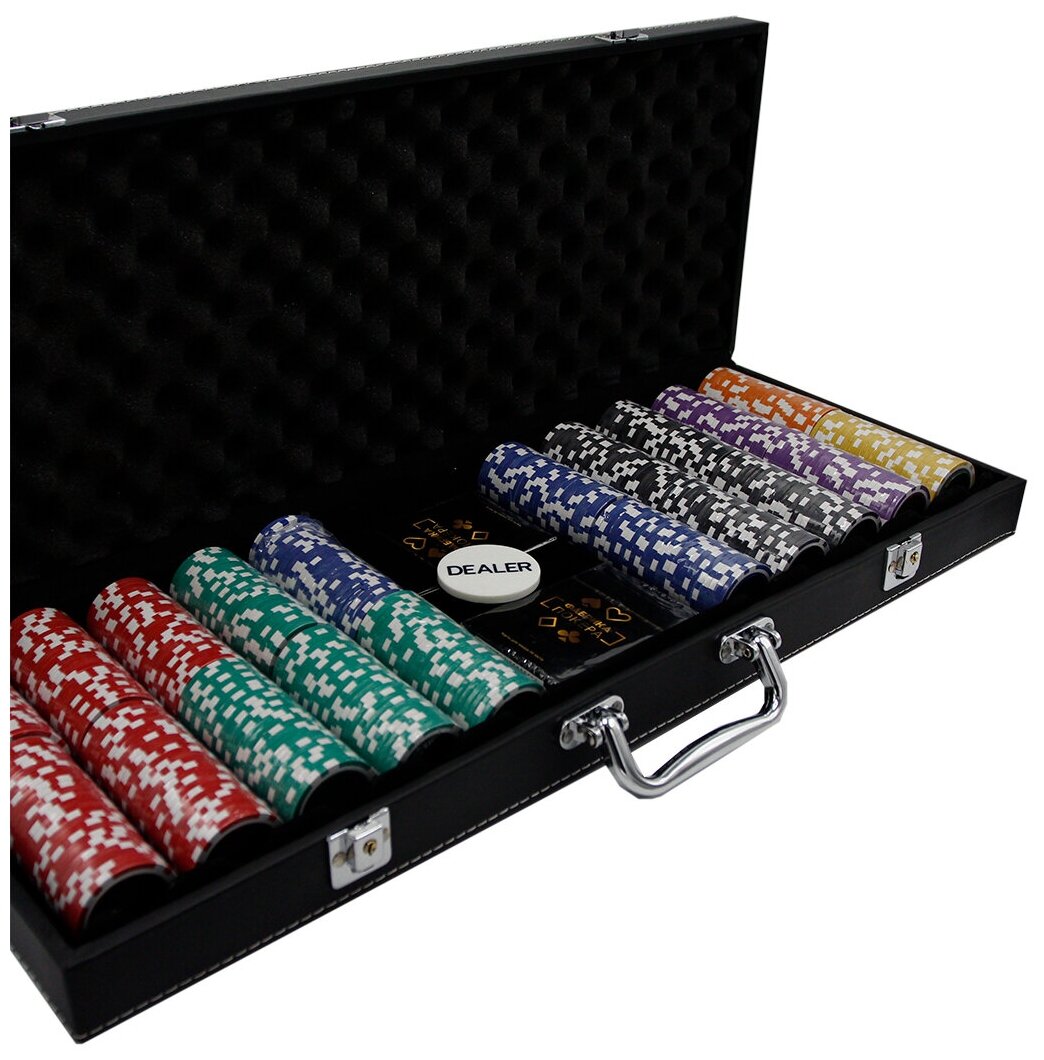 | В наборе | 500 стандартных фишек для профессиональной игры; фишка дилера; 2 колоды игральных карт, соответствующих качеству карт казино; кейс |