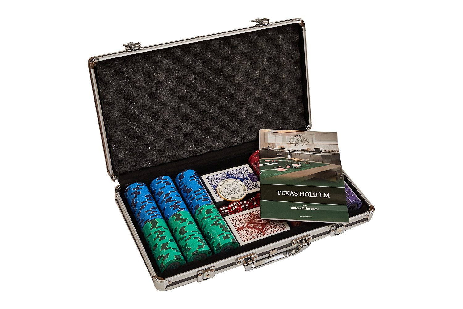 | В наборе | 300 фишек, 2 колоды карт, кости 5 штук, ключи для кейса, кейс металлический, картонная упаковка. |