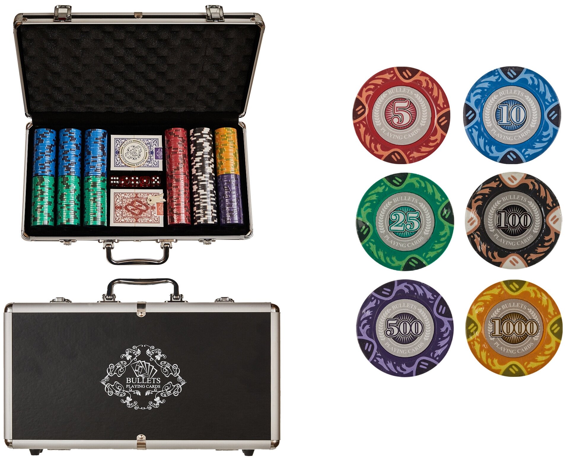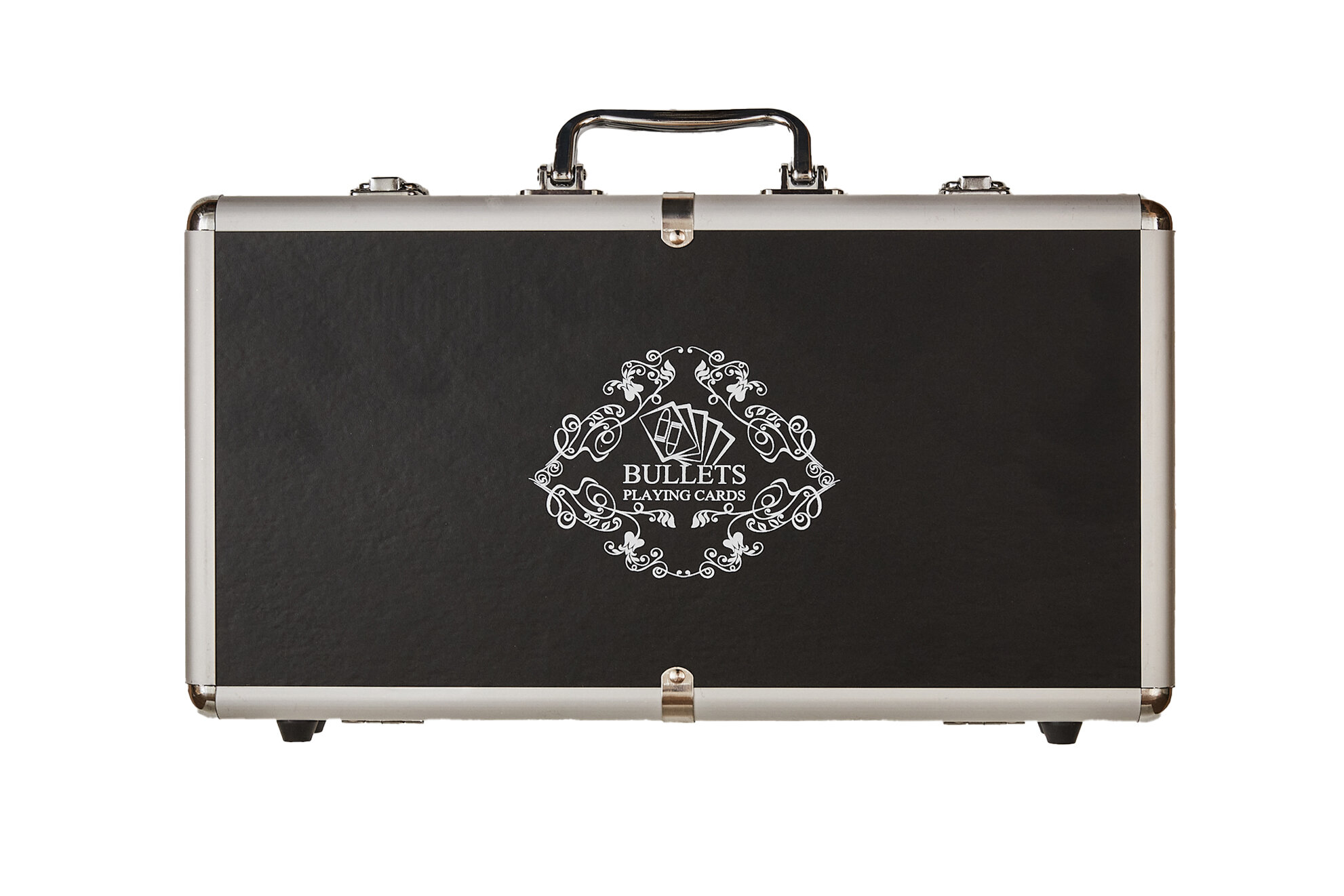 Набор для покера Bullets POKER в алюминиевом черном кейсе, 300 фишек + 2 колоды карт + 5 кубиков