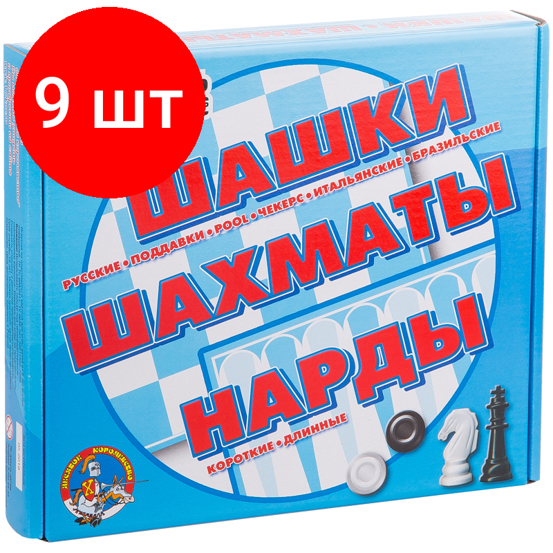 СохранитьКомплект 9 шт, Набор игр Десятое королевство 3в1 (нарды, шашки, шахматы), пластиковые, картонная коробка интересное: