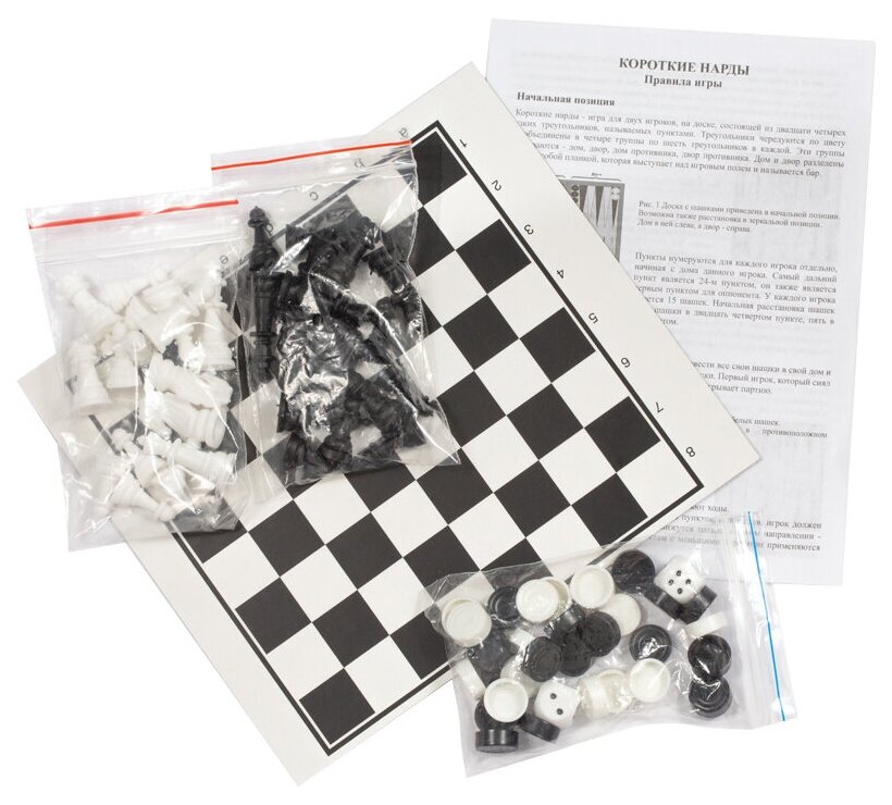 | Подробная комплектация | - жесткое двустороннее поле -1 шт;- шашки - 30 шт;- шахматы - 32 шт;- кубики - 2 шт;- правила игры. |