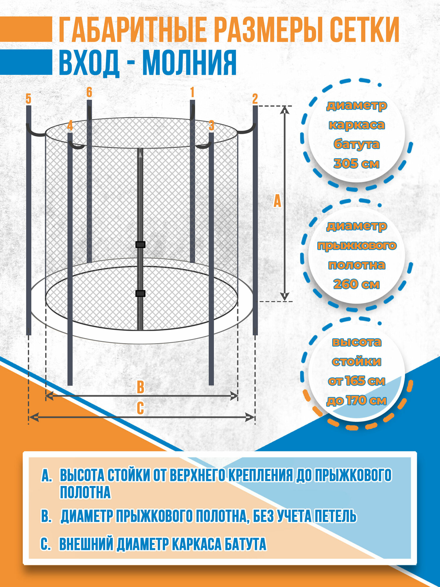 Купить Сетка внутренняя для батута 10 футов - на диаметр прыжкового полотна 260 см, 6 стоек, молния