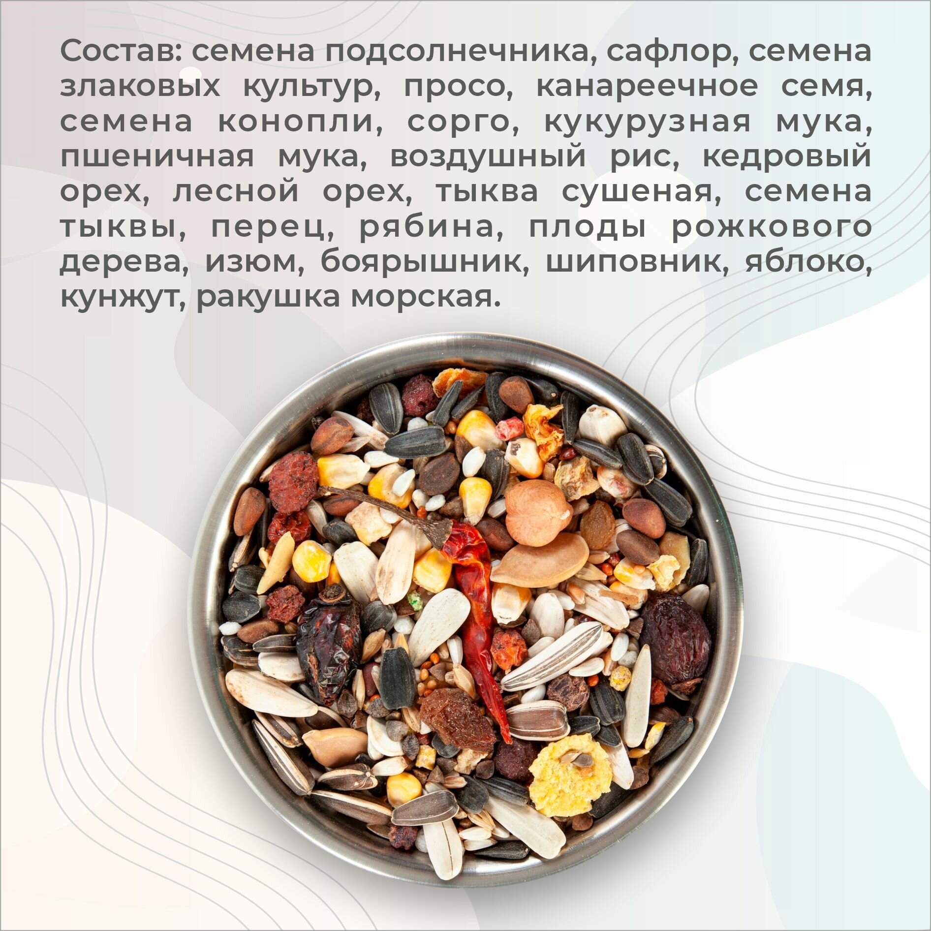 | Состав | семена подсолнечника, сафлор, семена злаковых культур, просо, канареечное семя, семена конопли, сорго, кукурузная мука, пшеничная мука, воздушный рис, кедровый орех, лесной орех, тыква сушеная, семена тыквы, перец, рябина, плоды рожкового дерева, изюм, боярышник, шиповник, яблоко, кунжут, ракушка морская |