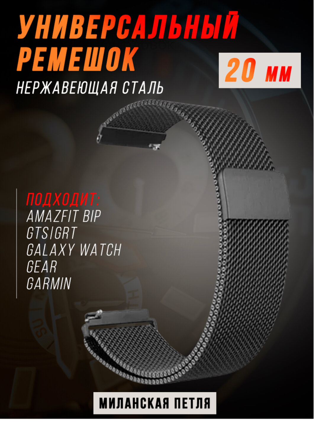 Купить Металлический магнитный ремешок 20мм для Amazfit Bip /GTR /GTS/ Galaxy Watch /Gear /Huawei /Honor миланская петля Черный