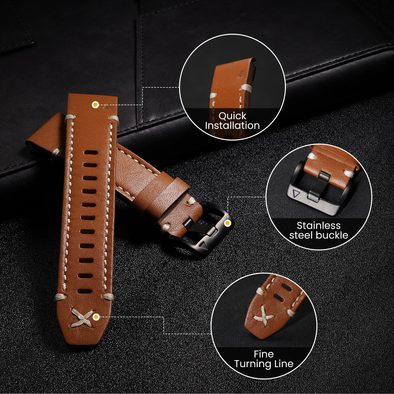 Ремешок из натуральной кожи для Garmin Fenix 6X Pro/6X/5X/7X Quick Fit Band, Brown-siliver buckle, 22 мм