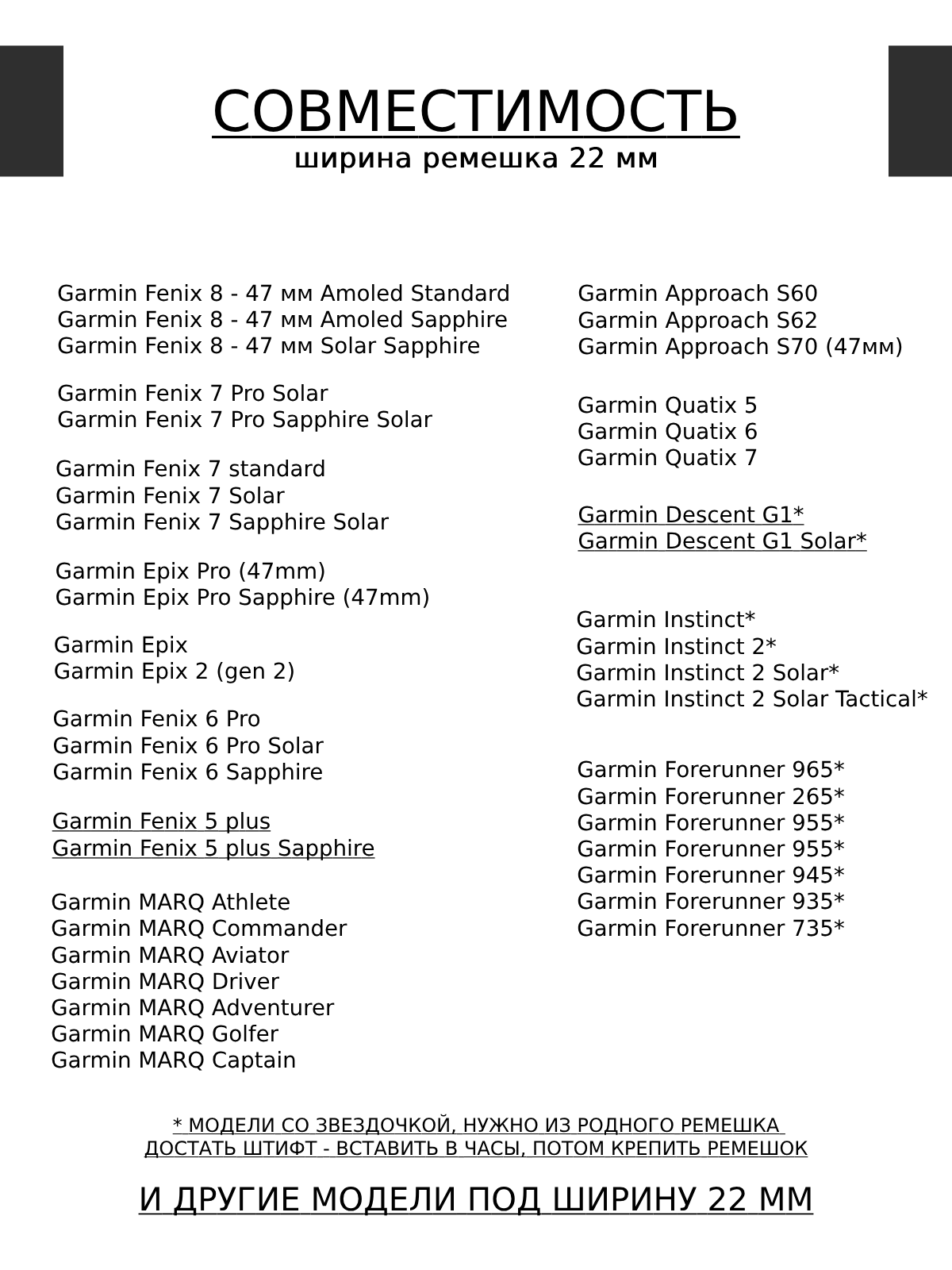 | Совместимые модели умных часов | Garmin Approach S60, Garmin Approach S62, Garmin Fenix 5, Garmin Fenix 5 Plus, Garmin Fenix 6, Garmin Fenix 6 Pro, Garmin Fenix 6 Pro Solar, Garmin Fenix 7 Solar, Garmin Forerunner 255, Garmin Forerunner 255 Music, Garmin Forerunner 745, Garmin Forerunner 935, Garmin Forerunner 945, Garmin Forerunner 955, Garmin Forerunner 955 Solar, Garmin Instinct, Garmin Instinct 2, Garmin Instinct 2 Solar, Garmin MARQ Adventurer, Garmin MARQ Athlete, Garmin MARQ Aviator, Garmin MARQ Commander, Garmin MARQ Driver, Garmin Quatix 5, Garmin Quatix 6 |