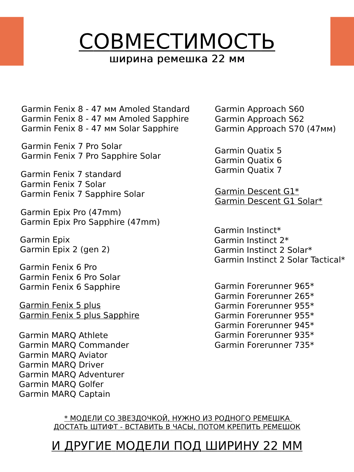 | Совместимые модели умных часов | Garmin Approach S60, Garmin Approach S62, Garmin Fenix 5, Garmin Fenix 5 Plus, Garmin Fenix 6, Garmin Fenix 6 Pro, Garmin Fenix 6 Pro Solar, Garmin Fenix 7 Solar, Garmin Forerunner 255, Garmin Forerunner 255 Music, Garmin Forerunner 745, Garmin Forerunner 935, Garmin Forerunner 945, Garmin Forerunner 955, Garmin Forerunner 955 Solar, Garmin Instinct, Garmin Instinct 2, Garmin Instinct 2 Solar, Garmin MARQ Adventurer, Garmin MARQ Athlete, Garmin MARQ Aviator, Garmin MARQ Commander, Garmin MARQ Driver, Garmin Quatix 5, Garmin Quatix 6 |
