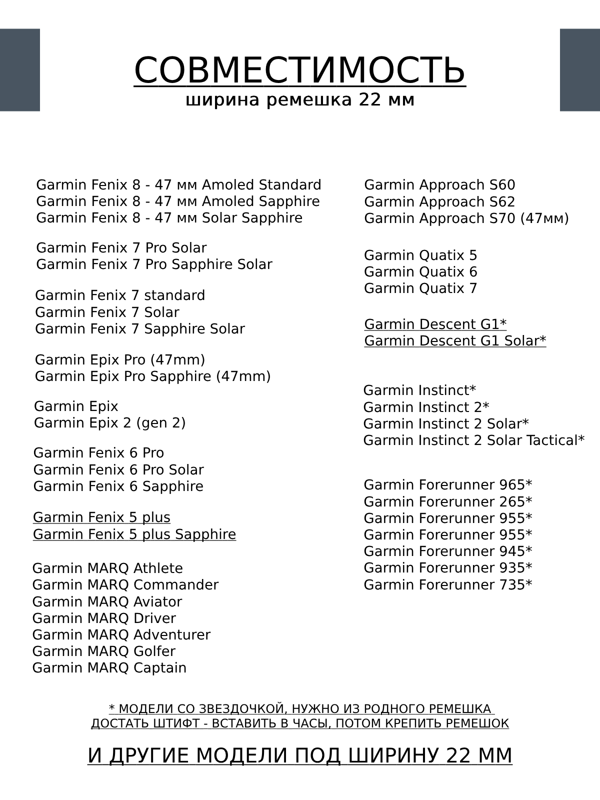 | Совместимые модели умных часов | Garmin Approach S60, Garmin Approach S62, Garmin Fenix 5, Garmin Fenix 5 Plus, Garmin Fenix 6, Garmin Fenix 6 Pro, Garmin Fenix 6 Pro Solar, Garmin Fenix 7 Solar, Garmin Forerunner 255, Garmin Forerunner 255 Music, Garmin Forerunner 745, Garmin Forerunner 935, Garmin Forerunner 945, Garmin Forerunner 955, Garmin Forerunner 955 Solar, Garmin Instinct, Garmin Instinct 2, Garmin Instinct 2 Solar, Garmin MARQ Adventurer, Garmin MARQ Athlete, Garmin MARQ Aviator, Garmin MARQ Commander, Garmin MARQ Driver, Garmin Quatix 5, Garmin Quatix 6 |