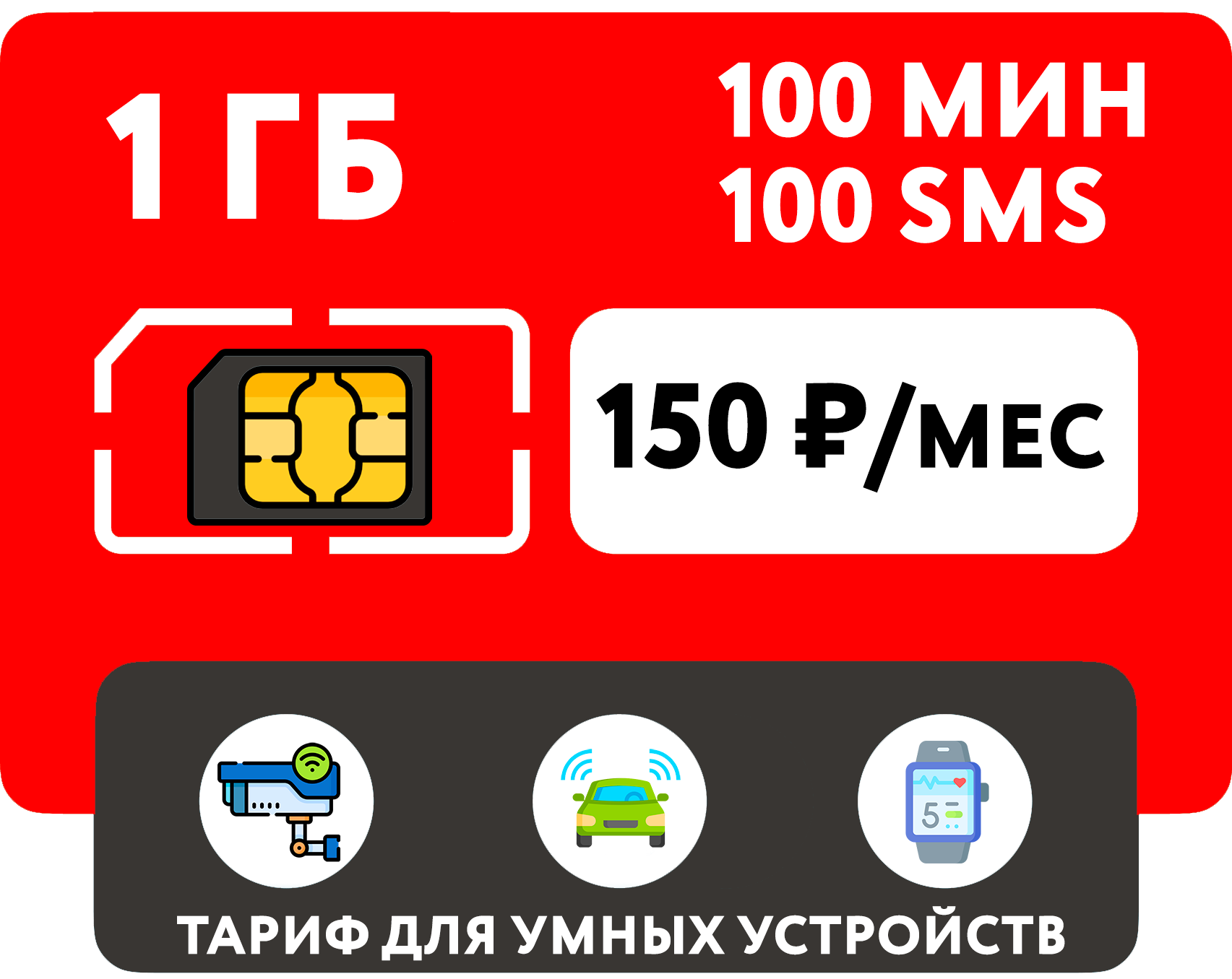 Купить SIM-карта 1 гб интернета, 100 мин, 100 sms за 150 руб/мес для умных устройств (Москва, Московская область, Россия)