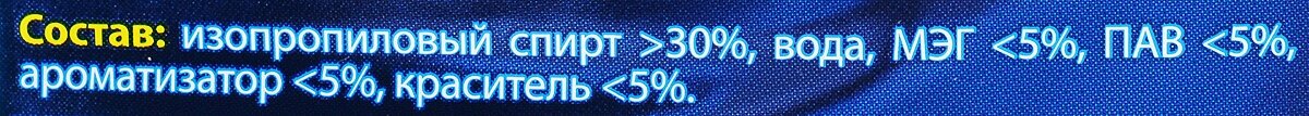 | Состав | спирт изопропиловый, вода, МЭГ (моноэтиленгликоль), а-ПАВ, ароматизатор, краситель |