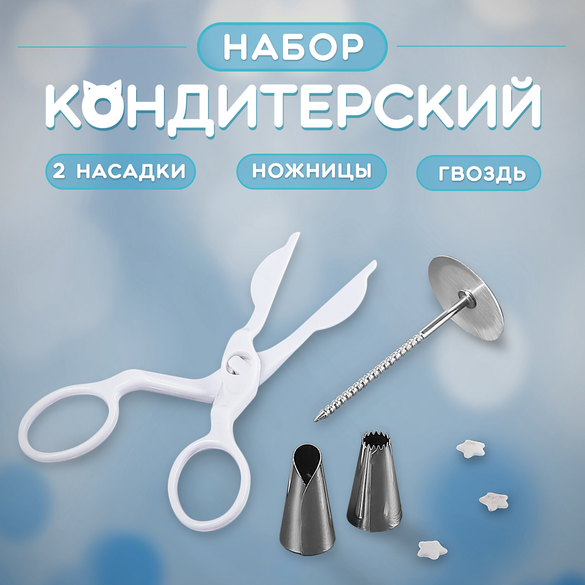 Купить Доляна Набор кондитерский Доляна, 4 предмета, 2 насадки d=1,7 см, ножницы кондитерские для переноски украшений, гвоздь d=0,3/3,3 см