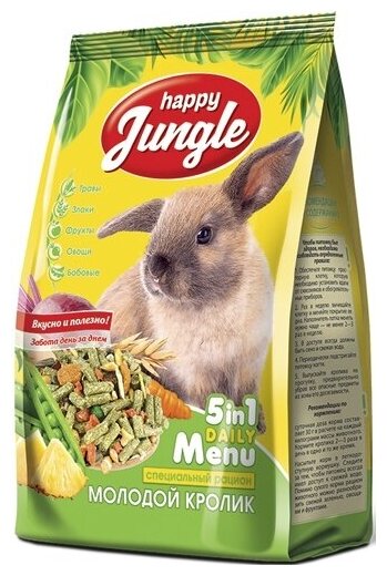 Сухой корм для молодых кроликов до 6 месяцев Happy Jungle 5in1 для грызунов daily menu фрукты 400 г