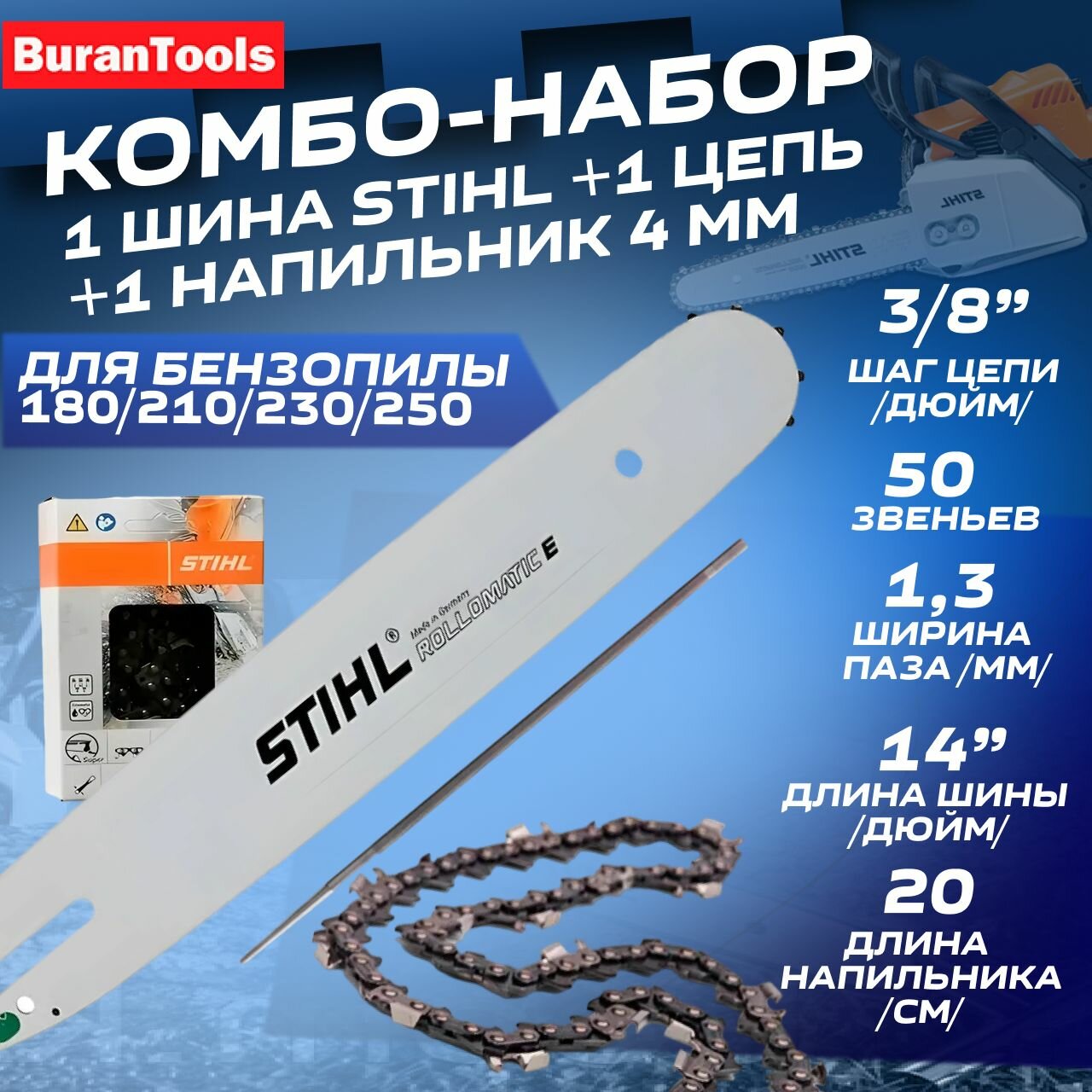 Комбо-набор Цепь для бензопилы Штиль 1 шт + Напильник + Шина 35 см (14"), шаг 3/8", паз 1,3 мм, 50 звеньев STIHL интересное:
