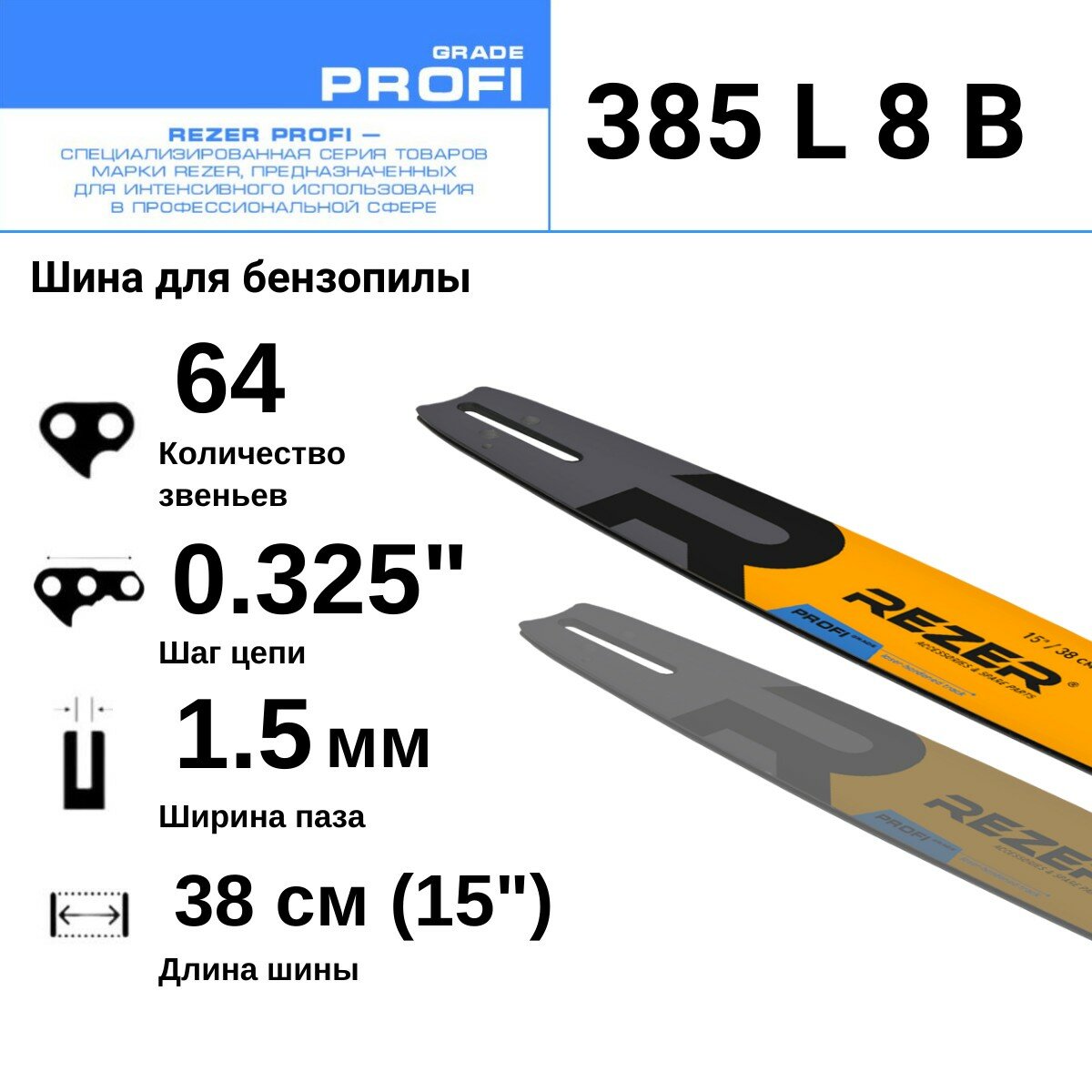 Купить Rezer PROFI 385 L 8 B Шина для бензопилы Husqvarna (Хускварна) 339, 345, 353, 357, 359, 455, 460, Carver 45-15, 64 звена, длина шины 15"( 38 см) , шаг 0.325", ширина паза 1.5 мм