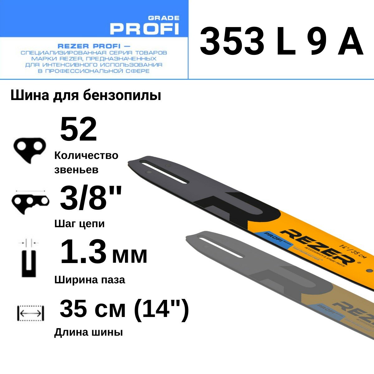Купить Rezer PROFI 353 L 9 A Шина для бензопилы Husqvarna 236/240, Partner, Poulan, Makita, 52 звена, длина шины 14"( 35 см) , шаг 3/8", ширина паза 1.3 мм