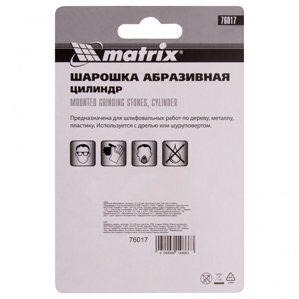 Шарошка абразивная, цилиндр, 19 x 25 x 6 мм, F46, 3 шт Matrix интересное: