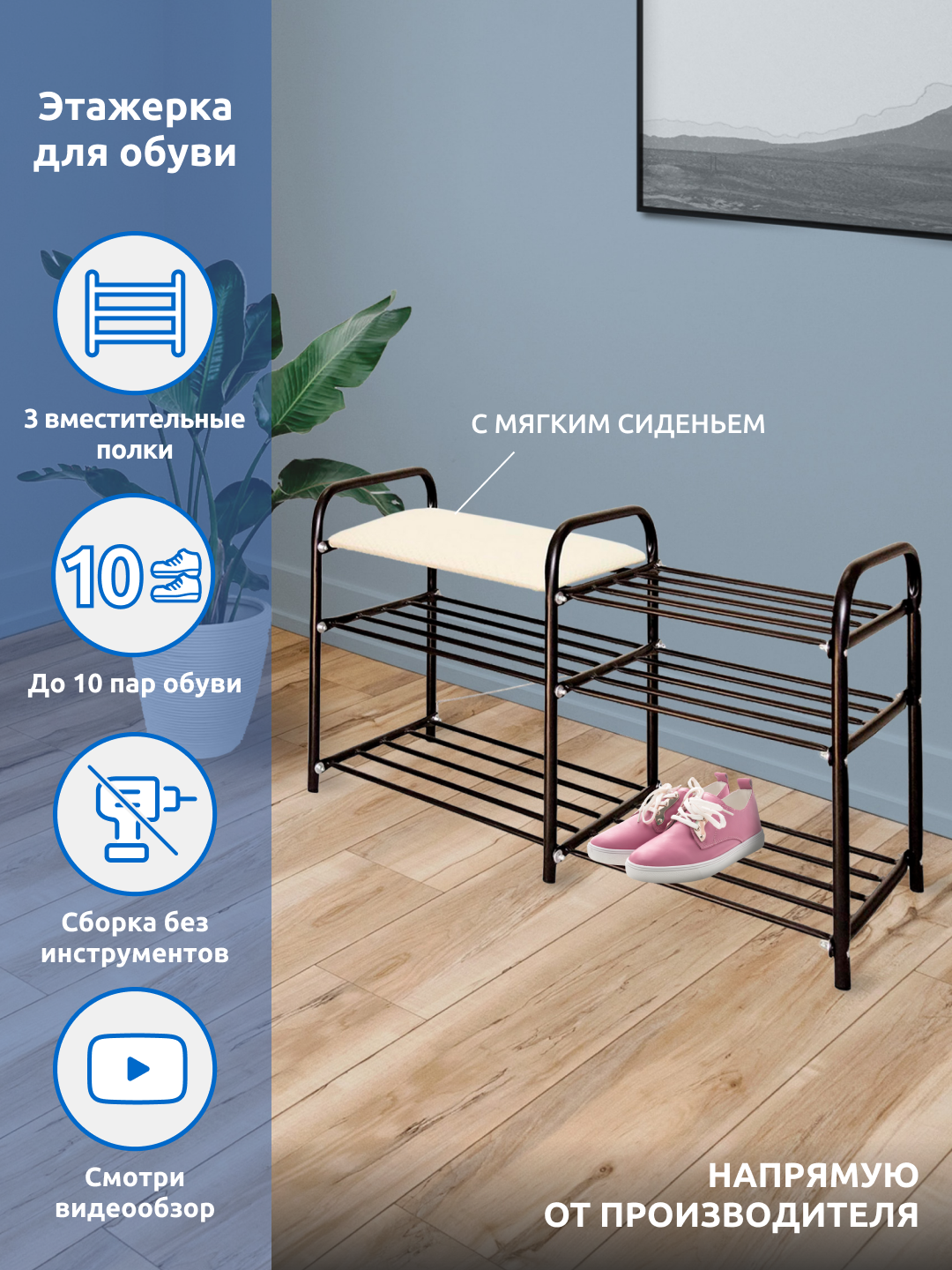 НИКА ООО Этажерка для обуви с мягким сиденьем Nika Люкс, 3 полки, 79 x 33 x 50 см, черный / слоновая кость