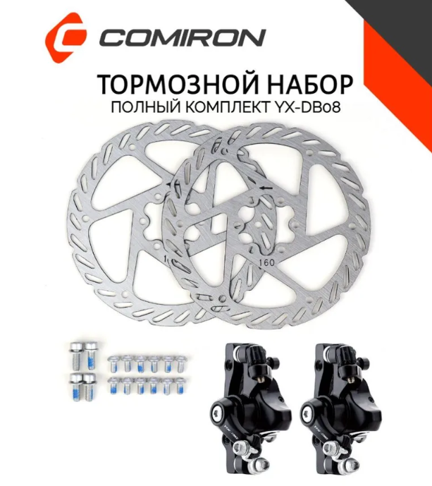 Тормозной набор дисковый механический передний задний COMIRON YX-DB08, ротор YRT-05-A, 160мм, чёрный, цельнолитой, круглые колодки (P01) /уп 25/ интересное:
