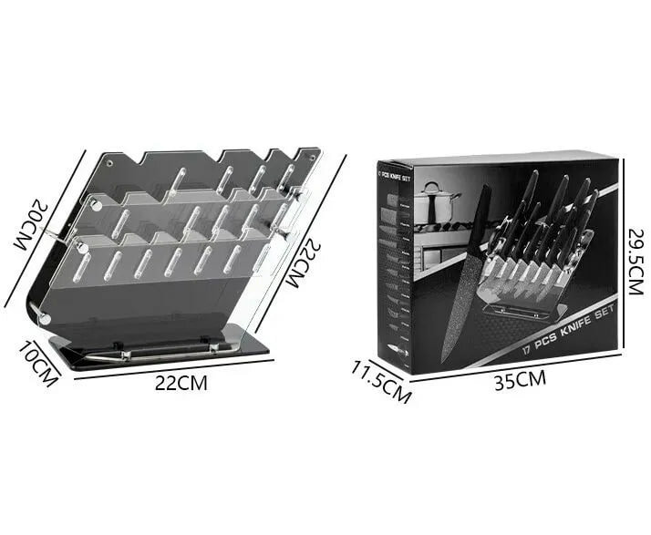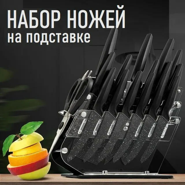 | Комплектация | в наборе 17 предметов: ножи 15шт; ножницы; подставка |