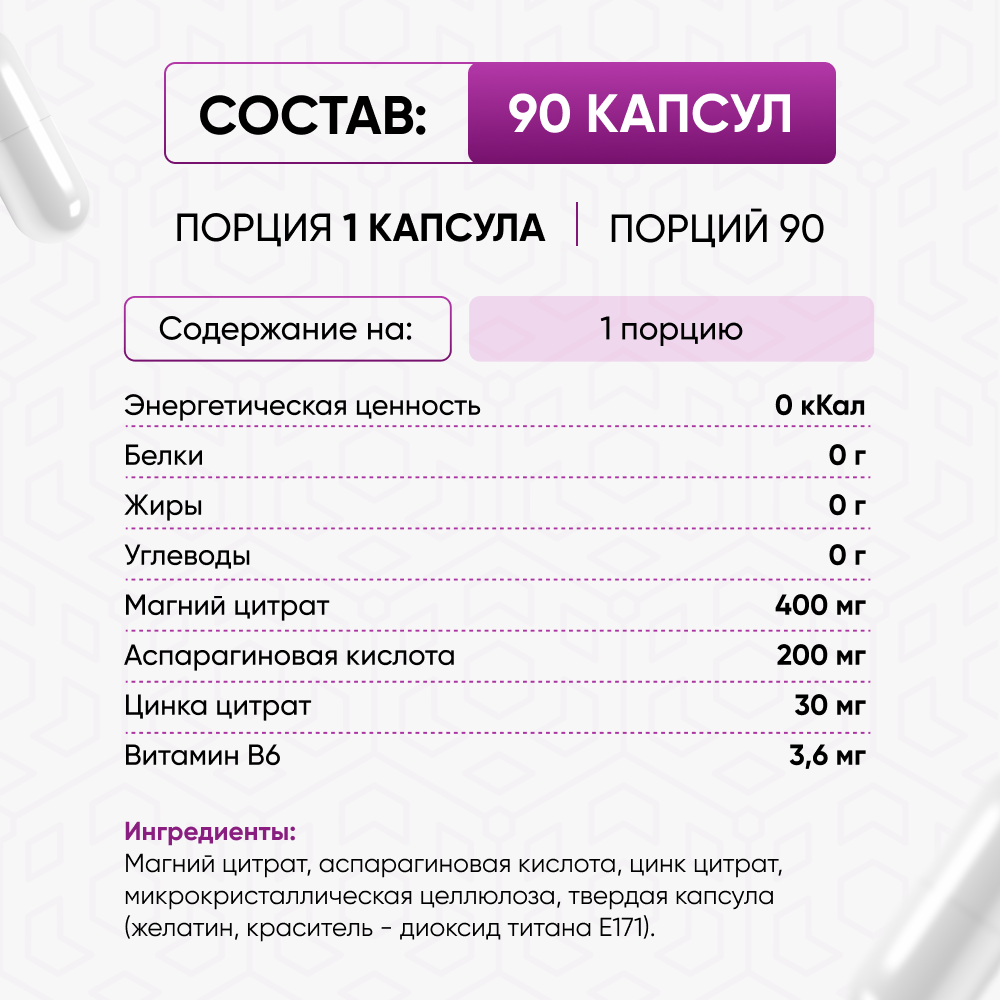 | Дополнительная информация | Цель: Восстановление, Выносливость, Повышение работоспособности, Набор мышечной массы. Преимущества: витамины, которые помогут естественной выработке тестостерона. Состав: Магний (в форме магния цитрата) 84 мг; Цинк (в форме цинка цитрата) 22 мг; Аспарагиновая кислота 38 мг; Магния цитрат, твердая капсула (желатин пищевой), носитель мальтодекстрин, цинка цитрат, L - Аспаргиновая кислота. Порция 2 капсулы |
